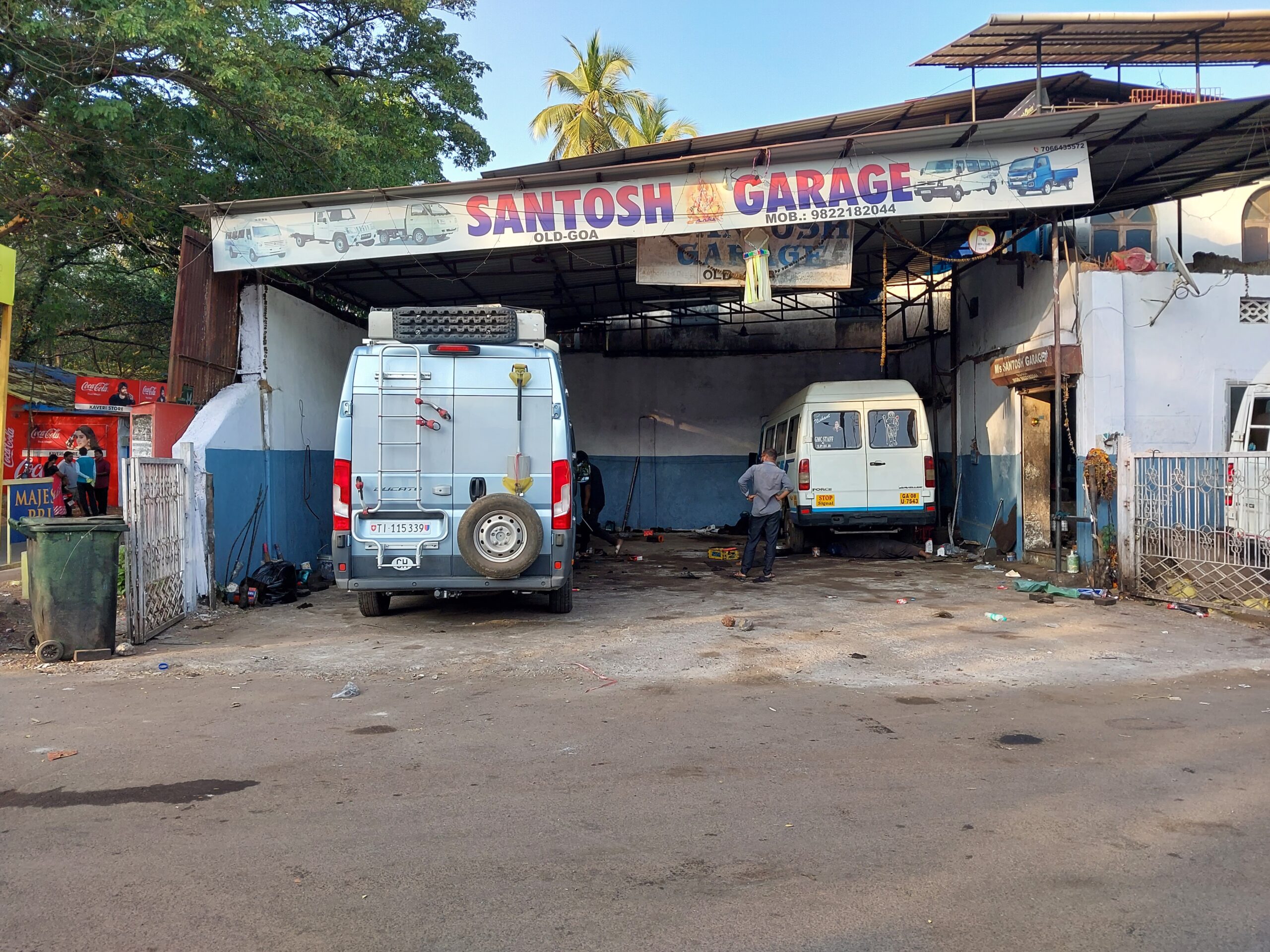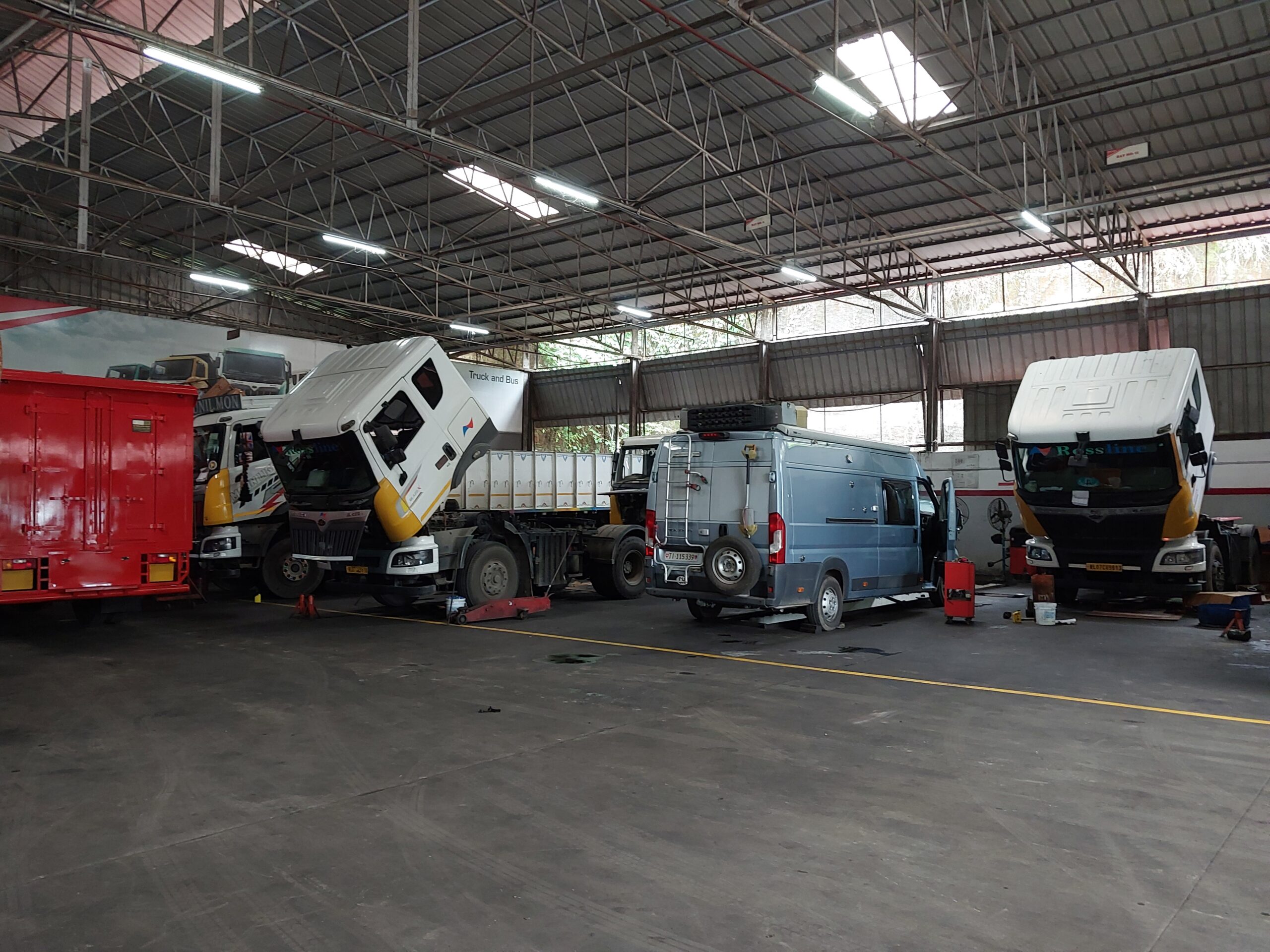 A Goa, j’avais essayé de faire le service que Jeep/Fiat Mumbai m’avait refusé. Malheureusement le «tuyau» d’aller chez «Force», une marque de minibus très répandue et produite en Inde, basée sur un fourgon Mercedes des années 1990, était percé. Ils étaient sensés avoir l’expérience et les équipements de levage, mais ils ne voulaient rien entendre, J’ai trouvé finalement un atelier, un abri plutôt, qui se disait réparateur «Force». Ils avaient moins de discours, moins d’images mais plus de cambouis sur les mains. J’ai fourni le filtre et acheté l’huile chez le marchand d’à côté et les mécanos ont fait le boulot, démonté la plaque de protection du moteur et changé le filtre et l’huile. Une heure environ, couché sur un carton posé à même la terra battue, pour trois cents roupees, soit environ trois de nos francs. Malheureusement, le marchand n’avait pas de plaquettes de freins, sinon on aurait fait ça aussi. Je profitais donc de mon passage à Cochin pour refaire l’exercice, parce que rouler avec des freins défectueux n’est pas la meilleure option, ni ici ni ailleurs. Néant chez le Jeep/Fiat de Cochin, idem chez Force. Je repris la route dépité, clairement embarrassé et un rien soucieux aussi, quand je vis une alignée de camions, de camionnettes et d’épaves dans une cour chez Mahindra, une autre grande marque indienne. Au point où j’en étais, je ne perdais rien à demander, mais là encore, le jeune ingénieur qui me répondait était négatif, ils ne trouveraient pas les pièces en Inde. Aimablement, mais agacé quand même, je lui dit mon étonnement qu’il considère mon Ducato comme une Ferrari F1, voir un Boeing, et qu’il pusse me laisser repartir avec des freins en mauvais état. Je lui proposais alors d’investiguer, puis d’essayer de chercher les pièces avant de trancher. Ce n’était pas directement un atelier de Mahindra, mais une société spécialisée qui fait pratiquement que cette marque, et du gros, au point que mon Ducato semblait perdu entre les gros camions dans l’atelier.