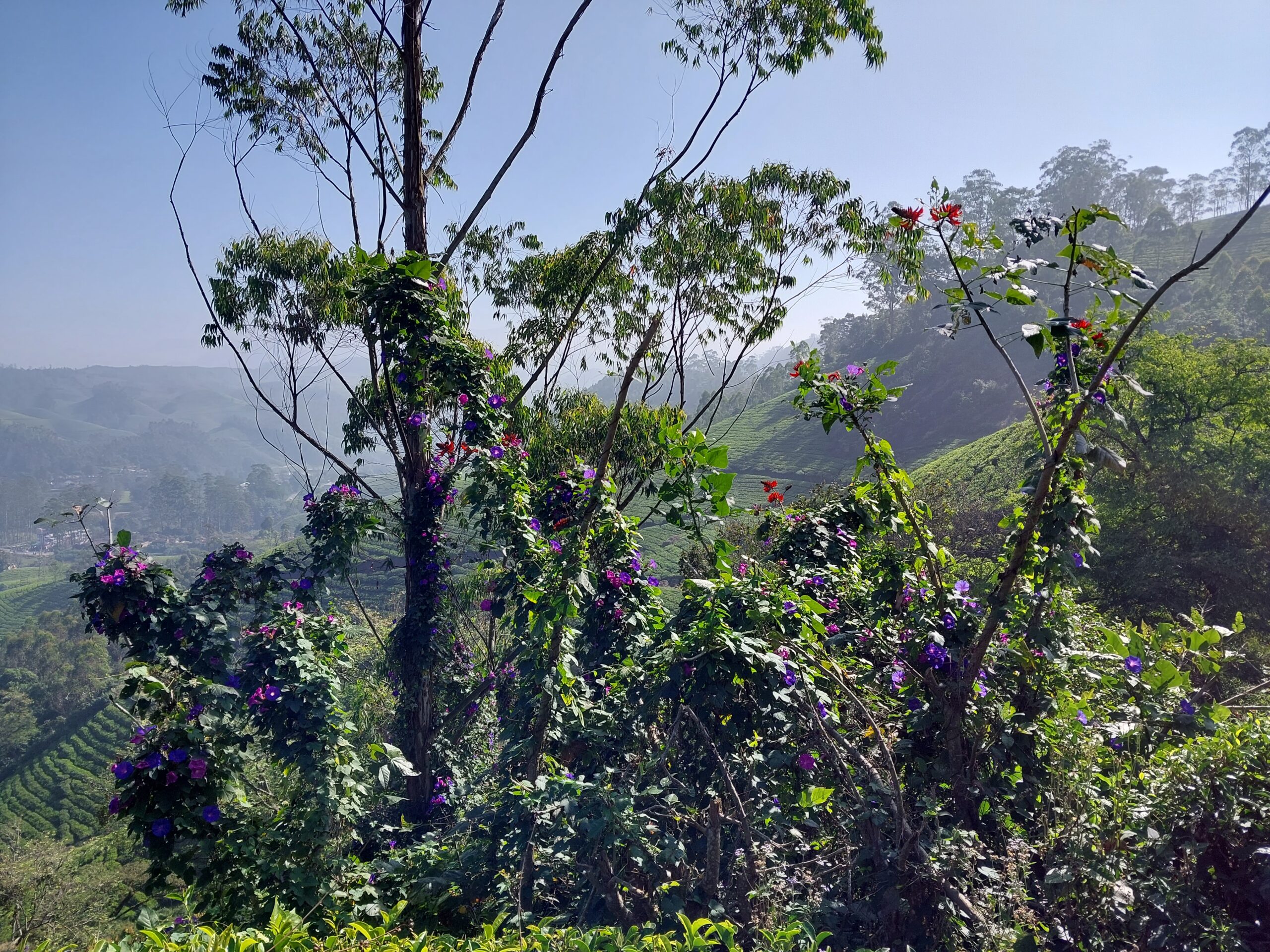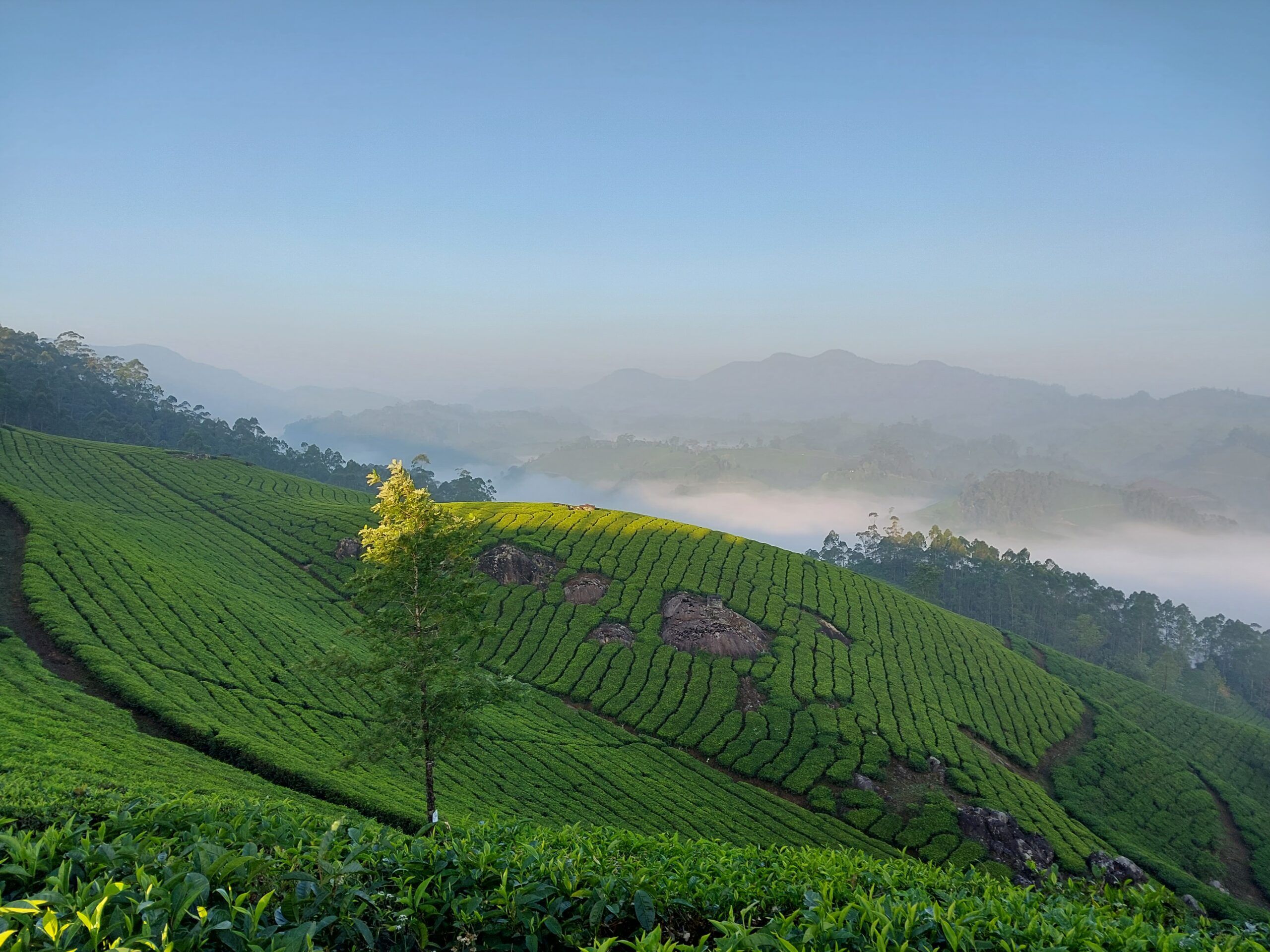 Je quittais Cochin pour Munnar, une petite station de montagne proche, très fréquentée par les Indiens qui y trouvent la fraîcheur de ses 1440m d’altitude, l’exotisme des petits villages et ces belles montagnes aux formes rondes, douces et voluptueuses comme les courbes d’une Apsara. La principale activité économique de la région est la culture du thé qui garnit les pentes de stries vertes du plus bel effet. Une balade en fin de nuit par les sentiers des plantations mène sur les crêtes et permet, en plus du spectacle du lever du soleil, la découverte des lignes successives des arêtes des vallées voilées de brume et les contours harmonieux des collines bordés des franges des bosquets d’eucalyptus. C’est très charmant, très délicat et parfait avant un petit-déjeuner tardif avec une dégustation de thé blanc, vert et noir.