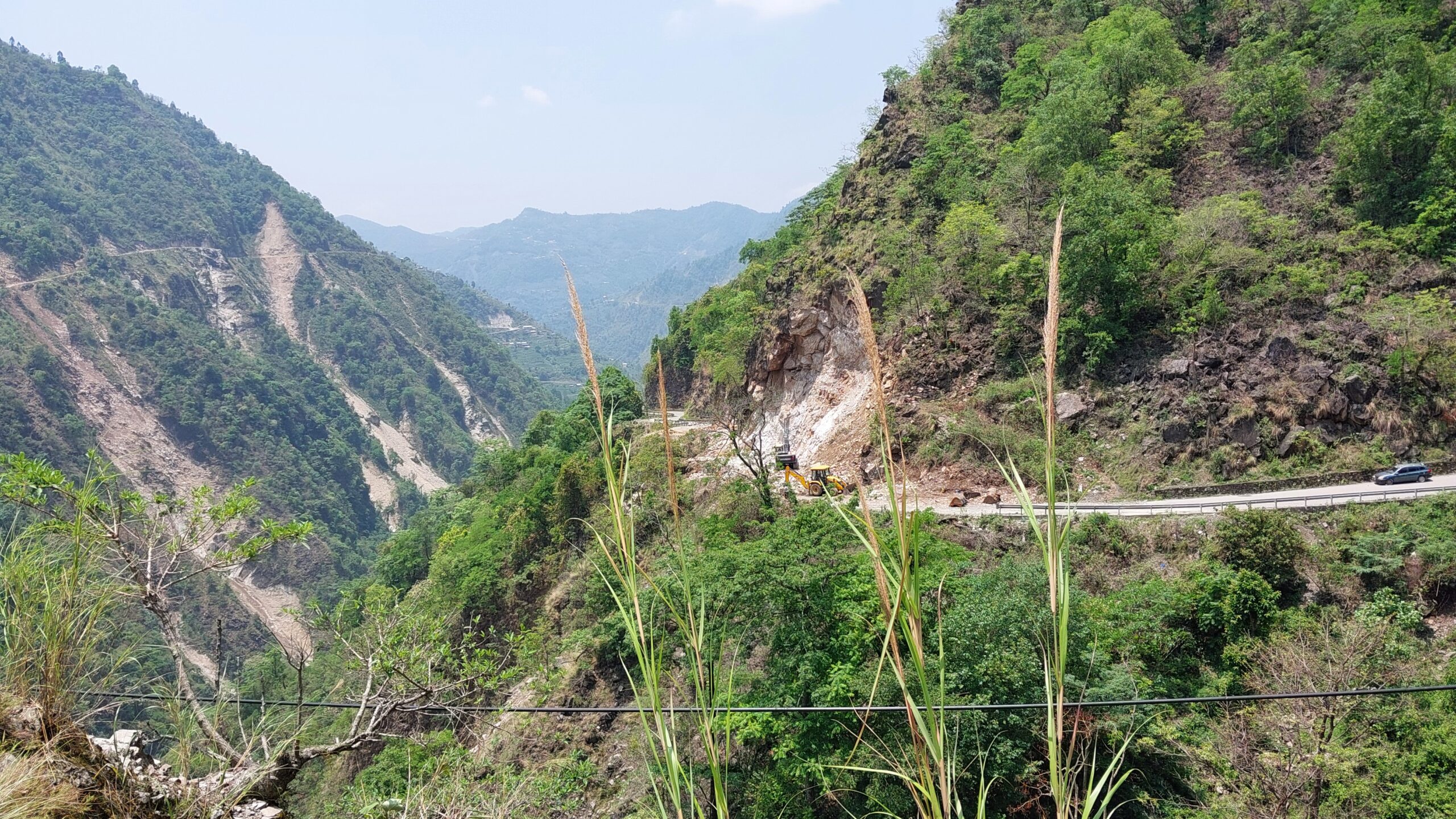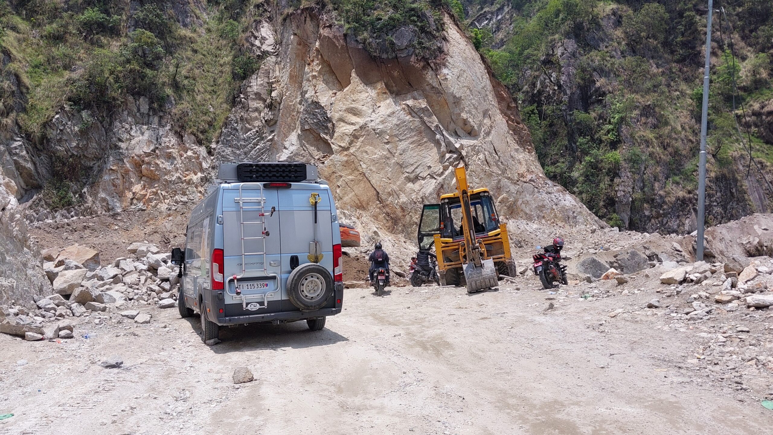 Le plus court, c’est généralement la petite dame du GPS qui choisit, m’affichant une carte de quelques centimètres carrés, sans trop d’information, même très lacunaire parfois. Naïf, je suivis donc à la lettre les indications virtuelles, passant de petits villages, suivant la route étroite et sinueuse qui plongeait dans des gorges profondes à flanc de pentes vertigineuses. Ici et là, un tronçon était rétréci par des éboulements, qu’une pelleteuse dégageait, recréant un revêtement très grossier de grosses pierres et de terre fine, que le bus, bien que très secoué, franchissait lentement, mais vaillamment. Ma progression était lente, mais Raxaul, la frontière avec l’Inde, se rapprochait et je pouvais envisager le passage en fin d’après-midi. Un peu plus loin, alors que je dominais la route en contre-bas je remarquai quelques véhicules arrêtés et une pelleteuse en action.