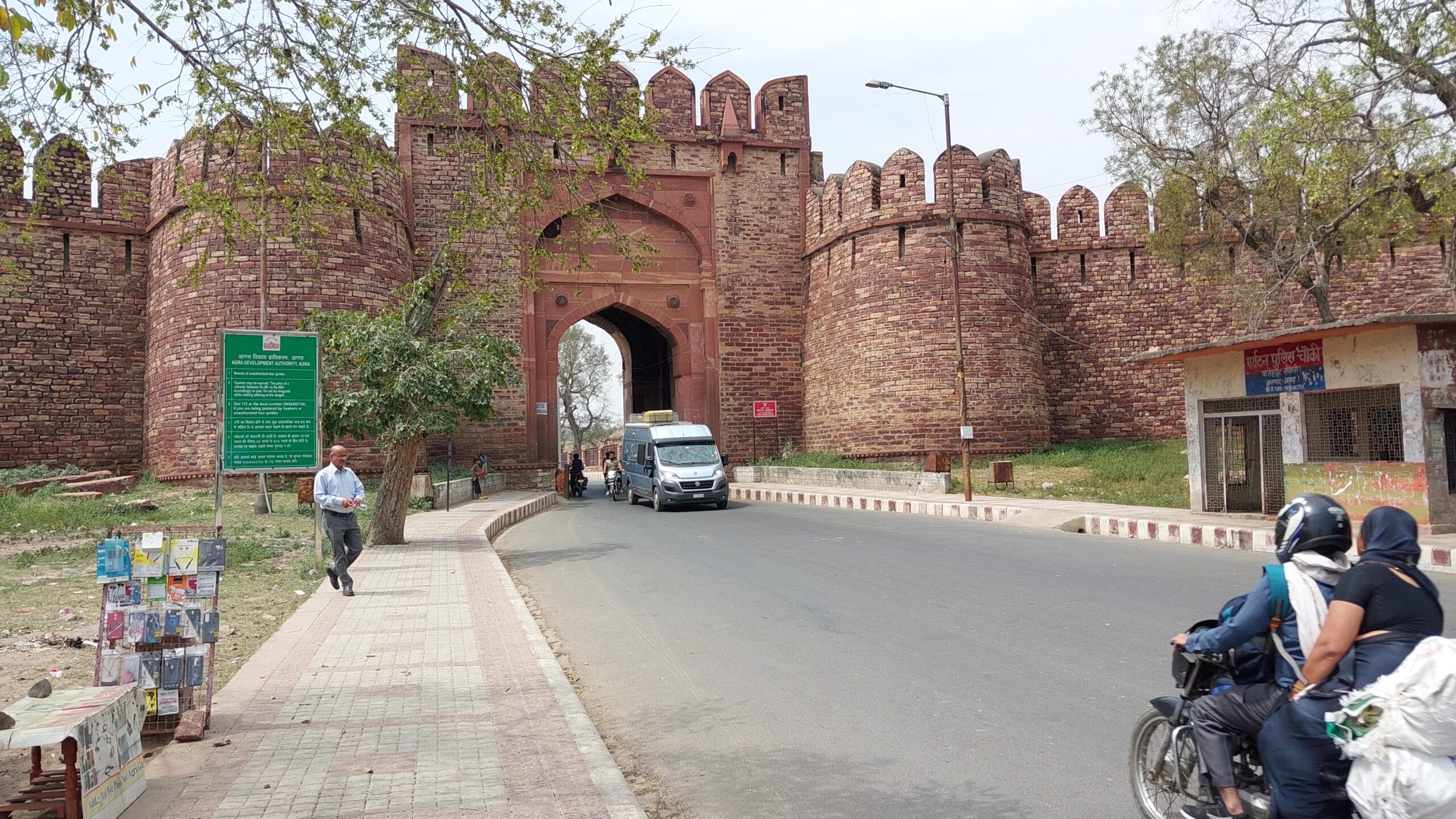Juste avant le passage du porche, je remarque un petit vendeur de rue, son minuscule étal installé dans une simple armoire en bois surélevée dont le fond et les portes ouvertes sont surchargés des produits de son commerce. C’est un mode assez fréquent en Inde, au passage sur un trottoir, on y vend un peu de tout, de la petite cuisine, des sandales de cuir que le cordonnier confectionne assis à terre devant sa boîte, un repasseur de chemises avec son fer au charbon de bois et là des accessoires de téléphone mobile. J’ai d’abord vu le porche, puis le vendeur et un large espace à ma gauche dans lequel je me suis glissé. J’ai montré le bus au vendeur, lui ai donné mon téléphone et je lui ai demandé de faire des photos quand je passerai sous le magnifique porche. Il a souri, visiblement amusé, et le jeu a commencé. Après le premier passage, on a critiqué ensemble les prises de vue. Le trafic encombrait la vue, alors on a recommencé, et encore une fois. Le vendeur de lunettes voisin s’est invité, ainsi qu’un autre quidam, tout le monde s’est amusé et le petit vendeur s’est réjoui des cinq cents roupees pour ce travail.