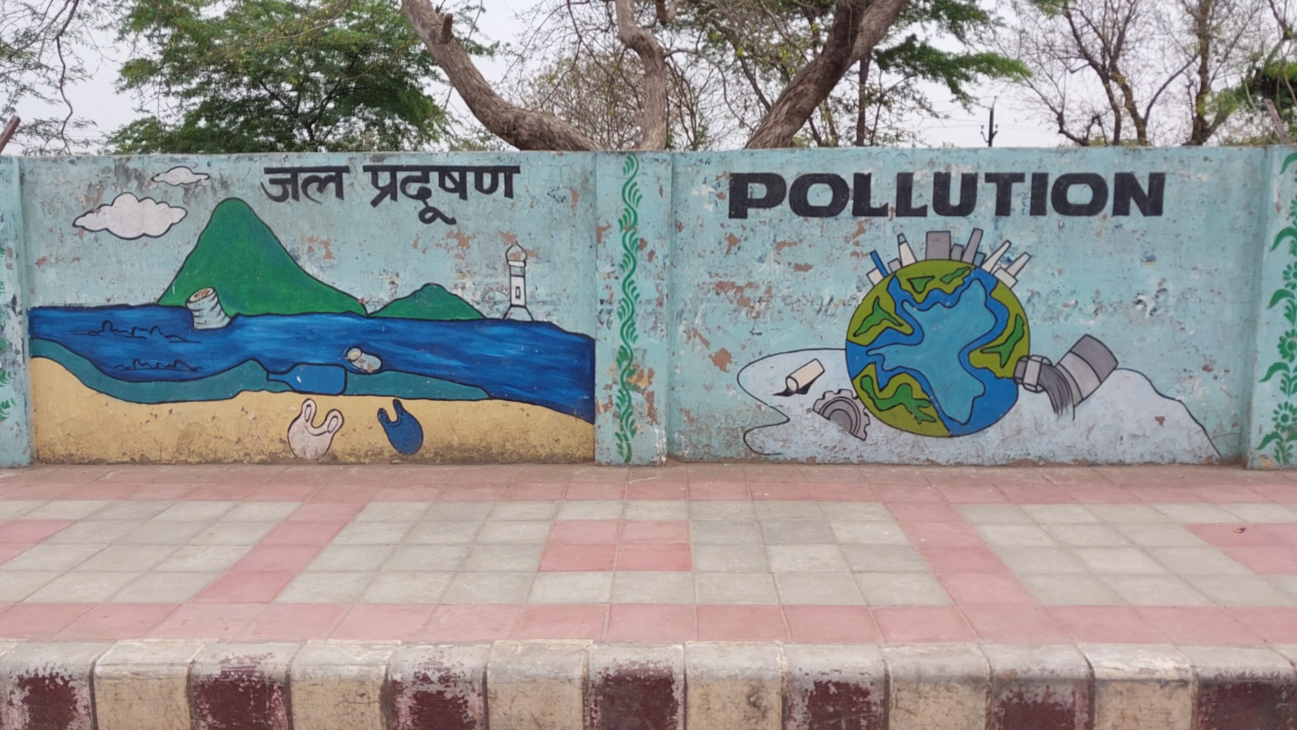 Le message relève l’importance de la protection de l’eau, de la gestion des déchets avec un accent particulier sur le plastique. C’est très joliment fait, les oiseaux, les arbres, les poubelles, tout y est pour apprendre à faire juste. Devant moi, à Mahabalipuram, mon guide avait balancé son gobelet vide par dessus le mur et par dessus le message, pas à la poubelle, puisqu’il n’y en avait pas. Ici c’est pareil, bien qu’il y en ait quelques unes au parking, le derrière du mur sert de dépotoir. Pas sûr donc que les stratégies déployées pour nettoyer l’environnement urbain soient les bonnes.