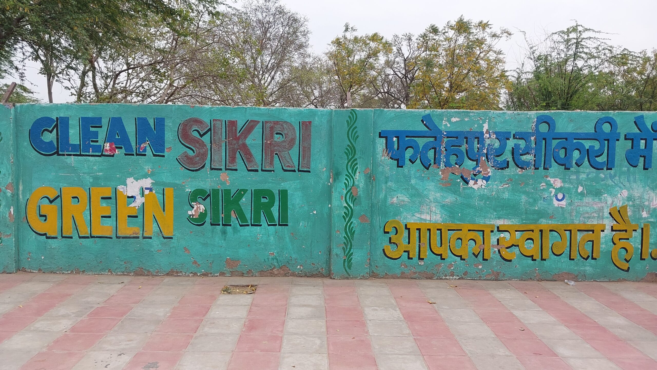 Le long de la route menant en ville et au site est bordé d’un long mur qui isole les propriétés derrière et comme souvent ailleurs, ces longs murs de maçonnerie servent de support publicitaire, dont le contenu est joliment peint. Souvent c’est de la publicité pour un ciment, un opérateur de téléphonie ou encore une marque de lait, parfois ce sont des décors plus libres, des motifs floraux, des scènes de vie ou des messages sur la protection de la nature. Là, je fus interpellé parce que c’était particulièrement bien réalisé, mais aussi parce que j’avais déjà vu ce message à Mumbai, à Mahabalipuram et ailleurs aussi.