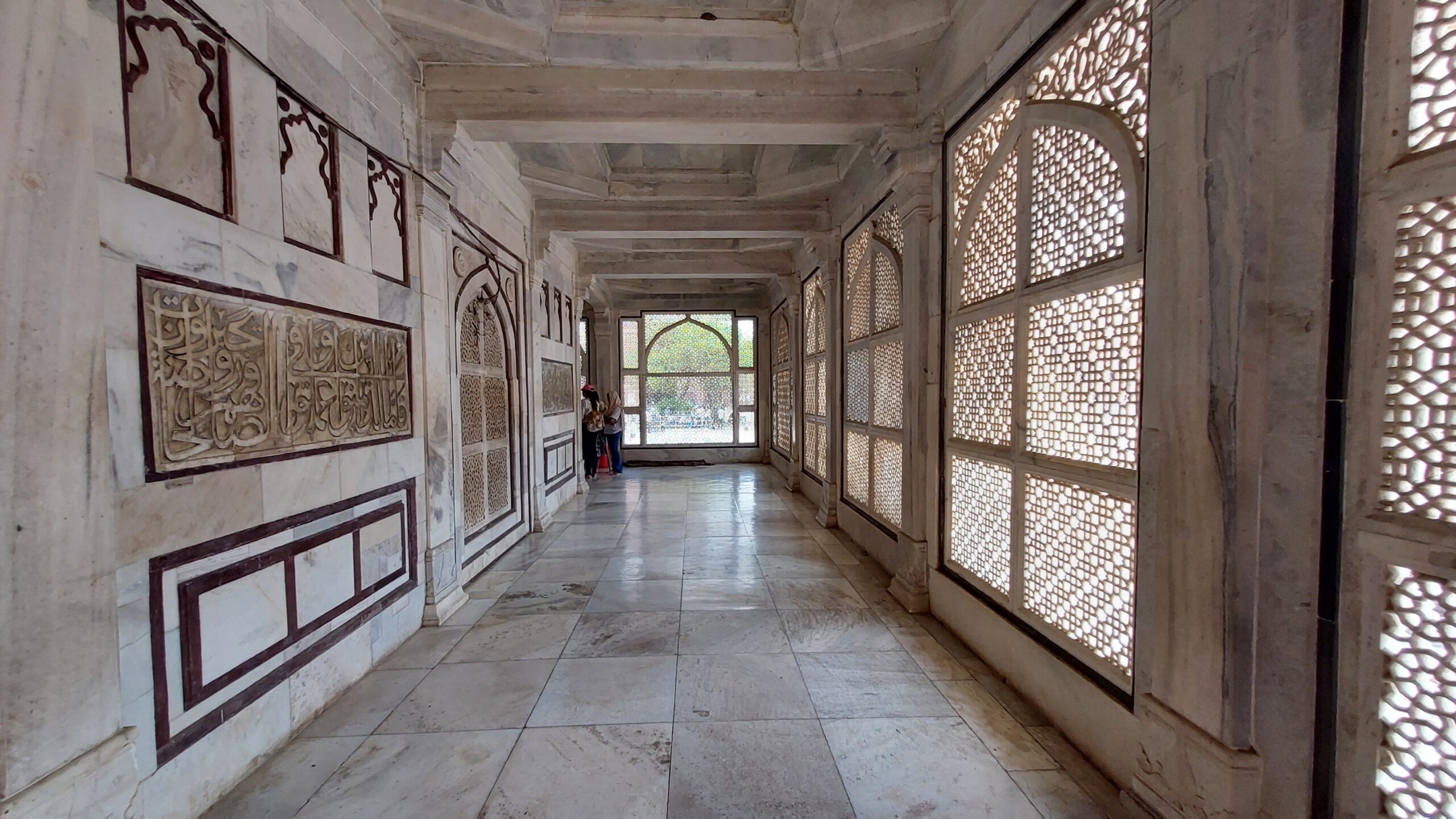 Un grand parking est organisé avant la ville et le site historique, où les guides et les chauffeurs de rickshaws abordent les arrivants sans les laisser souffler. Ignorant leurs appels empressés. malgré la chaleur, je choisis de marcher un peu, la grande mosquée n’est qu’à une demi-heure, bouger un peu ne pourra que me faire le plus grand bien. Au pied de l’escalier monumental, les marchands du temple attendent avec leurs babioles, glaces et boissons, mais aussi des statuettes en pierre, des éléphants, des boules ajourées, des bougeoirs, des colliers, toute une panoplie que l’on a déjà vue ailleurs et autre part et à chaque fois, des dizaines de vendeurs côte à côte proposent la même marchandise, cassant les prix un peu, et cassant les pieds plus que le précédents. Comment survivent-ils alors que le chaland est rare et reste indifférent à leurs suppliques ? Je suis abordé par un homme, la petite trentaine, d’une certaine autorité, qui me signale que les shorts ne sont pas autorisés mais que le gardien des chaussures dispose de pagnes pour me couvrir les genoux. Il n’est pas guide, il ne veut pas d’argent, il m’explique simplement comment accéder au lieu et les impairs à éviter, la tenue à observer dans le mausolée du saint homme Salim Chisti, où je dois me couvrir la tête, et dont les superbes moucharabiés délicatement taillés dans le marbre blanc méritent une attention toute particulière.