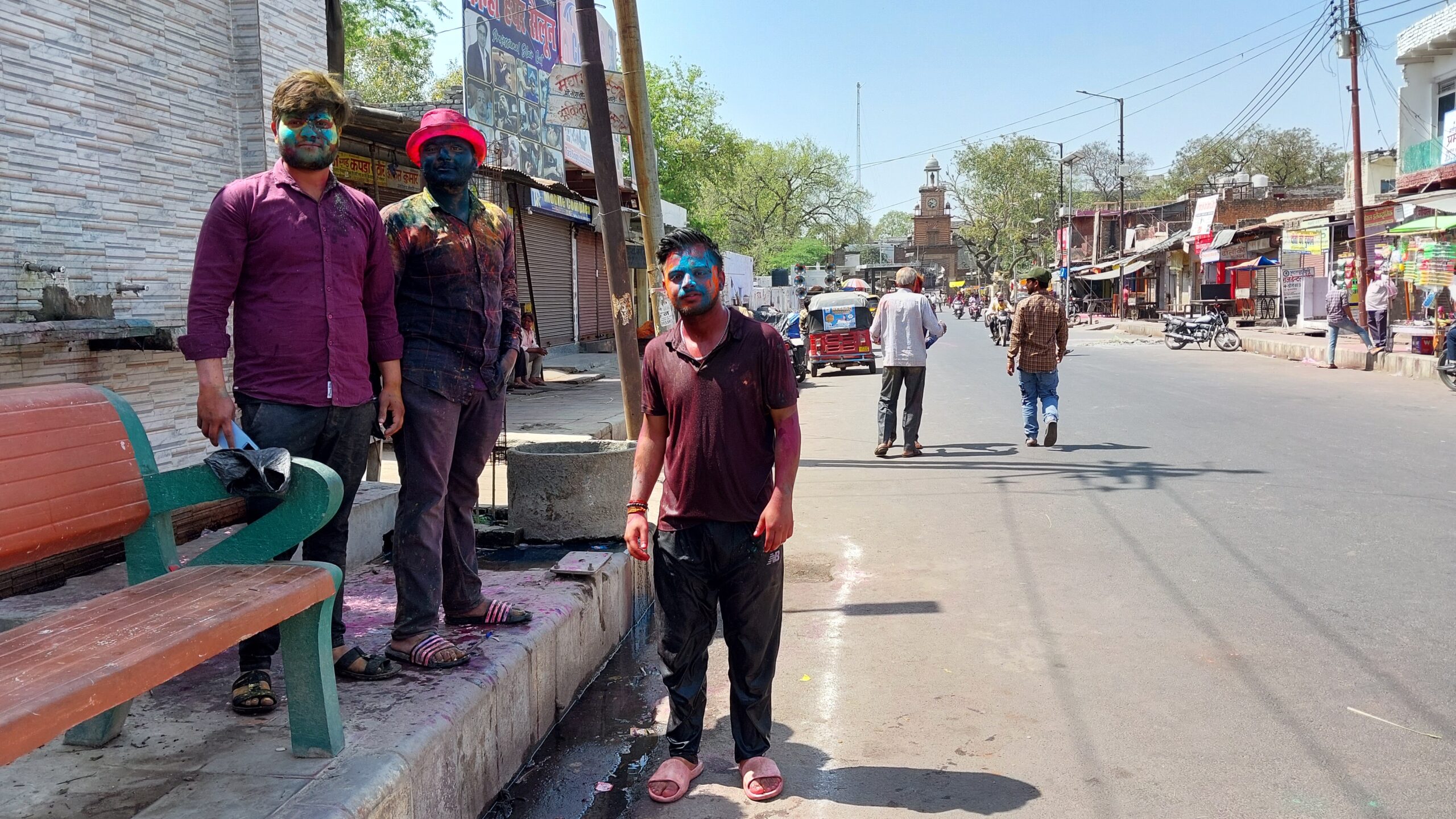 Ce sont des jeunes, hilares, qui m’orientèrent par leur accoutrement, leurs habits, leurs visages maculés, de bleu, de rouge, de jaune. Et des couleurs, il y en avait aussi par terre et sur leur moto. Des gamins, colorés eux-aussi, se courraient après en riant de leurs farces, et peut-être aussi de ma déconfiture, elle, sans pain ni beurre. Ce jour là était férié jusqu’au soir, joyeux et festif pour tous ou presque, surtout pour le farceur.