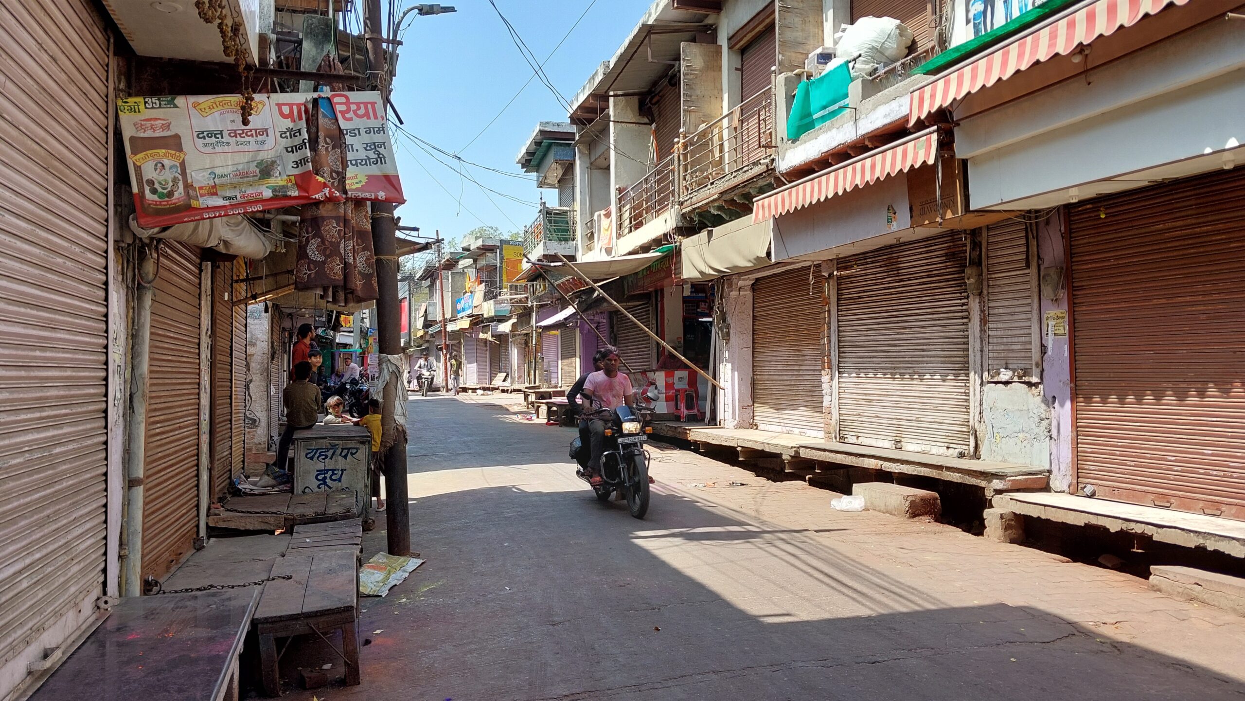 Le lendemain matin, surprise, la chaîne était tirée et l’abattant du comptoir fermé. A l’enseigne d’à côté, ils me proposèrent bien un riz byriani dont je ne voulus pas, mais rien d’autre. Celui d’à côté était fermé, le suivant aussi, ainsi que le prochain à cent mètres. Je fus donc forcé de revenir sur mes pas et de prendre au moins un thé dans le bourdonnement des mouches. Si j’avais vu le site historique, je n’avais pas parcouru la petite ville très typique, resserrée au pied de la colline, aux rues, ruelles plutôt, étroites et encombrées, animées, le chaland interpellant le marchand alors qu’un cycliste et deux scooters tentent de contourner une vache imperturbable. J’y vins donc, avec la ferme intention de profiter des nombreux restaurants en chemin et d’acheter fruits et boissons. Première déconvenue, les restaurants étaient tous fermés et dans les rues, tous les rideaux métalliques étaient tirés. Pourtant, bien qu’il n’y ait guère eu de monde dehors, ça ne donnait pas l’impression d’un couvre-feu ou de quelque chose de grave. Enfin, sauf pour mon estomac qui restait désespérément inassouvi. Je trouvais bien quelques vendeurs ambulants, mais là encore la muse était contre moi, ils ne proposaient que des oignons, de l’ail et du gingembre et franchement, croquer des oignons au petit-déjeuner… Je restais donc sur ma faim et mon questionnement.