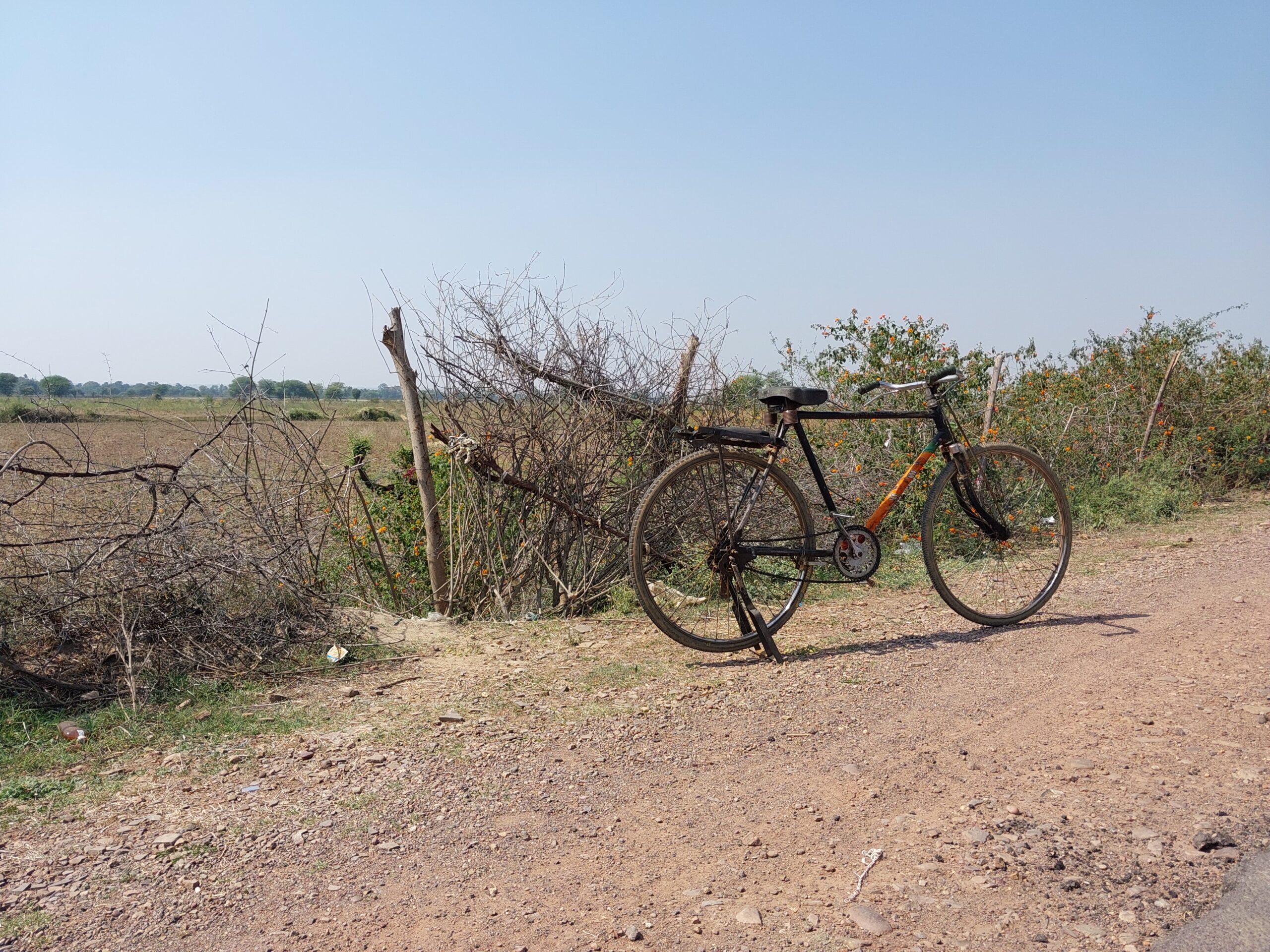 Depuis que j’ai quitté Hyderabad et pris une diagonale vers le nord ouest, tout m’apparait changé. Bien que qualifiée de «national highway», cette route ne ressemble en rien aux précédentes ; elle est étroite, composée uniquement d’une piste dans chaque sens et séparée par un traitillé blanc. La circulation a presque totalement disparu ; je ne croise que rarement un cycliste ou un tracteur, plus souvent quelques vaches sœuvrées qui semblent m’interroger sur la suite leur dharma.