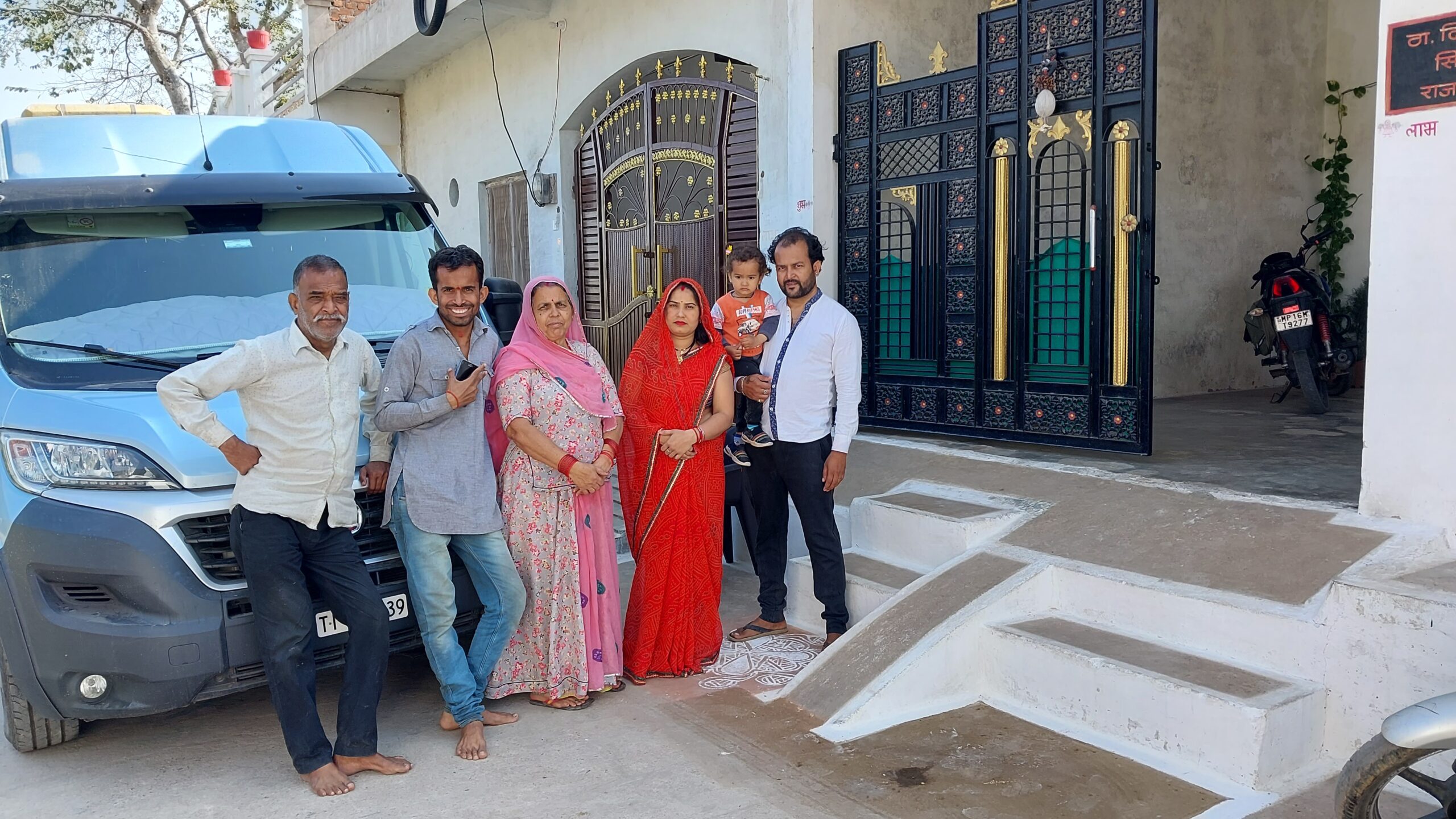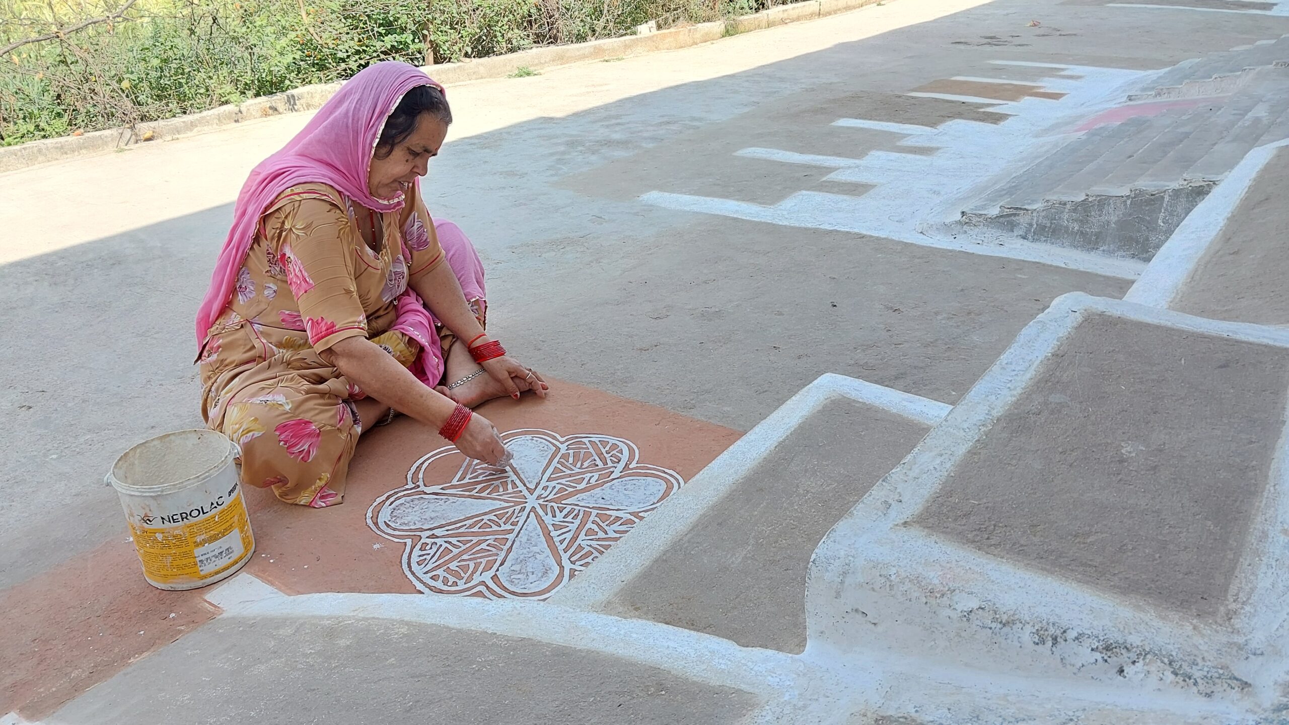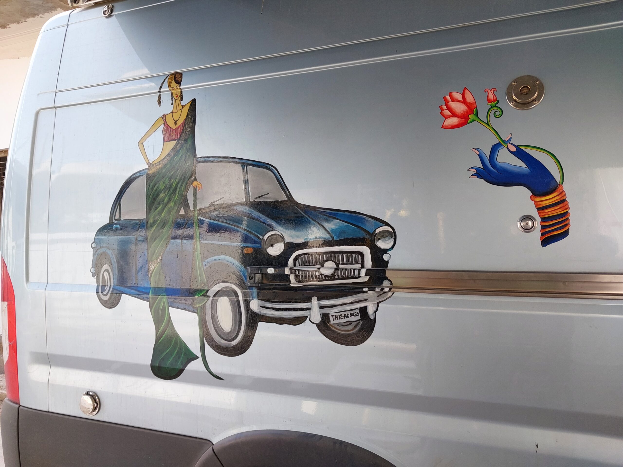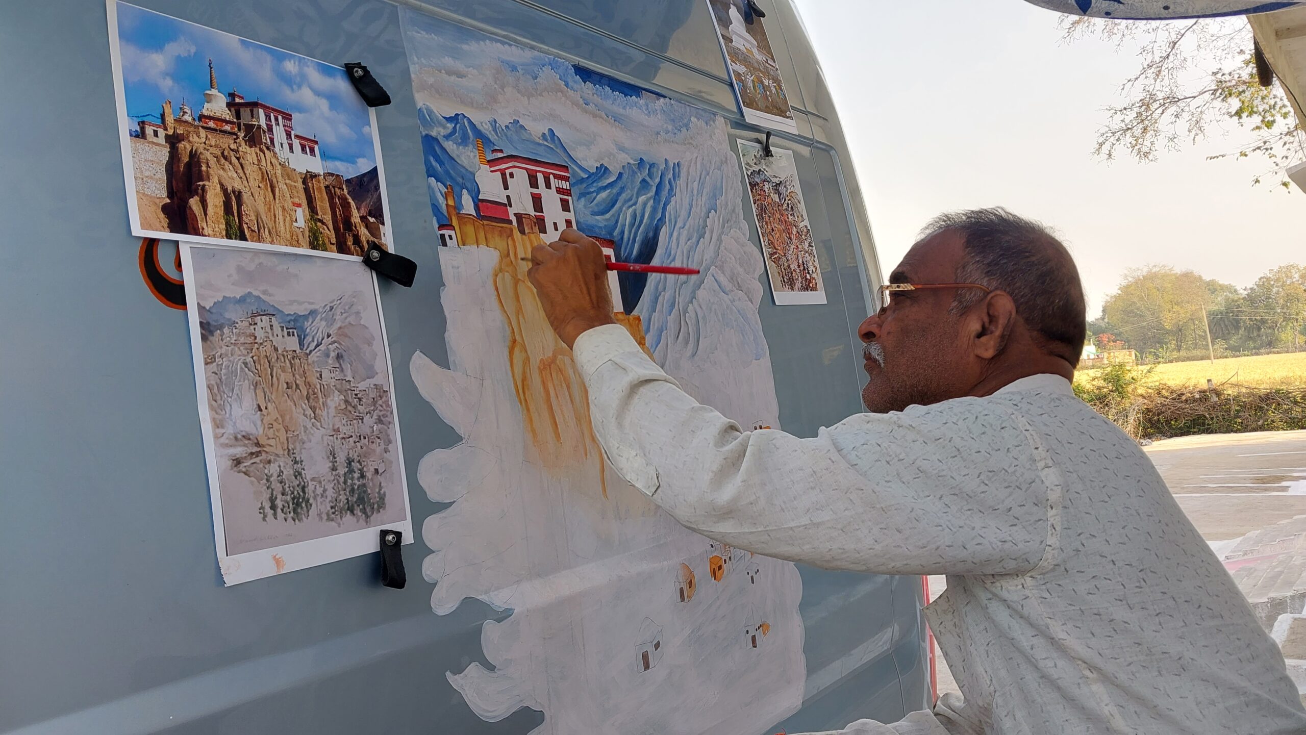 Le lendemain je m’installe dans la rue en cul de sac de leur lotissement, situé dans une petite banlieue, entourée de champs de blé, non sans avoir en passant fortement secoué la ligne électrique bien pendouillante et donné une inclinaison très généreuse à son support métallique rachitique. Le décor réalisé à Chennai, une femme en sari devant une Fiat 1960, très mode en Inde lors de notre premier voyage, se complétera d’une main tendant délicatement une fleur de lotus à ma passagère indienne clandestine, et du mantra courant Shubh « शुभा », appelant de bonnes augures. De l’autre côté, le monastère de Lamayuru va occuper le panneau arrière et j’y adjoindrai moi-même, sous la supervision et l’aide indispensable du maître, une autre main tenant une pivoine et le symbole tibétain Om « ».