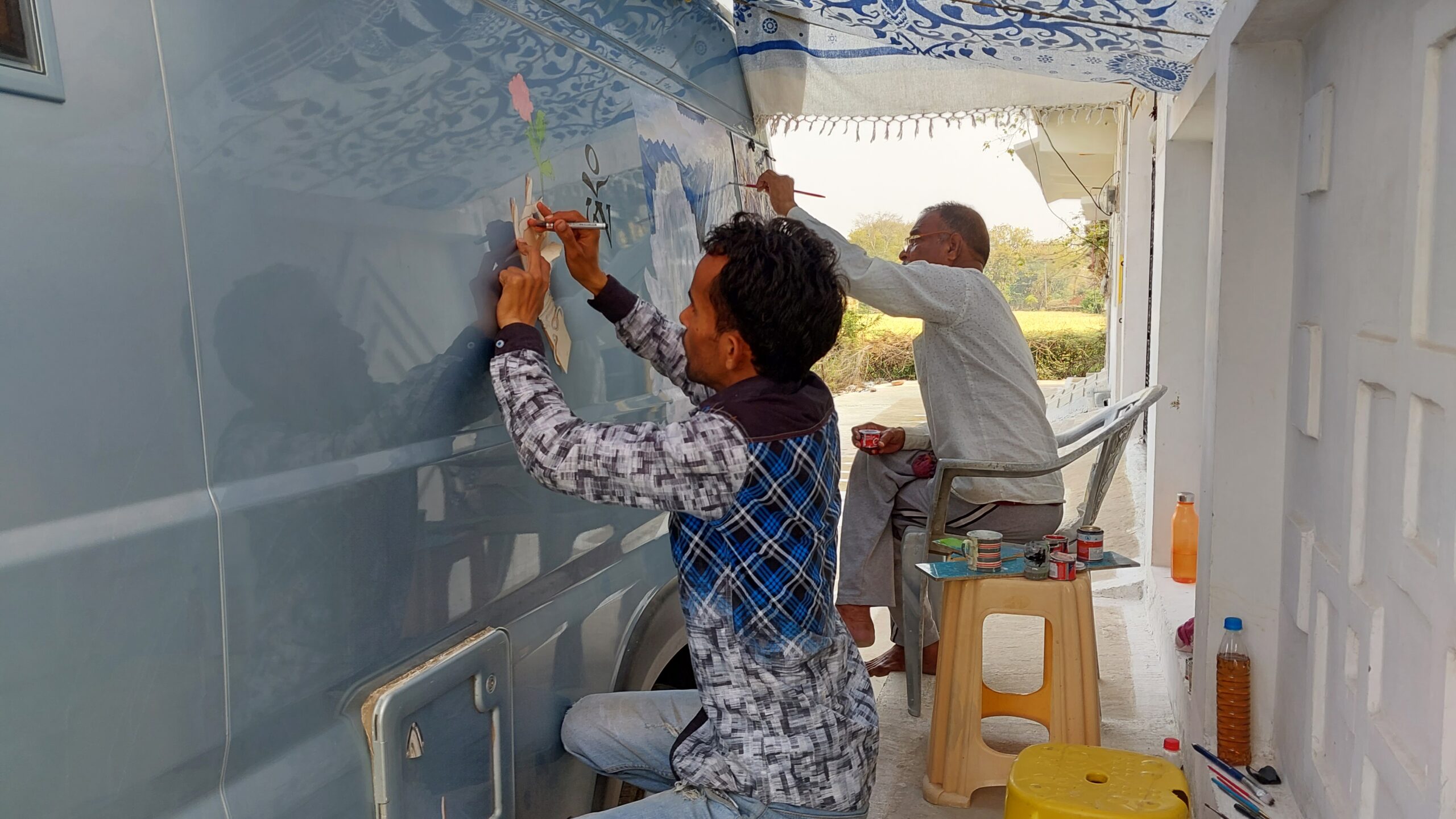 Je ne sais plus comment je suis arrivé dans la minuscule boutique des peintres. Peut-être en quittant le débit de boissons voisin, probablement attiré par un style qui se démarquait des miniatures ou d’autres figures mogholes exposées vers l’extérieur. Les peintres, le père Dinesh et son fils Gajraj, sont charmants, généreux de leur temps, enthousiastes de leurs travaux conjoints et visiblement heureux de ma curiosité naïve. Après l’expérience de décoration du bus à Chennai, j’imaginais adjoindre une petite touche supplémentaire, un accompagnement qui aurait complété l’œuvre réalisée. Je lâche l’idée, qui les interpelle et les fait sourire. Ils n’ont jamais peint sur un véhicule, mais l’idée fait rapidement son chemin, des détails se précisent, les éléments se décident. Ils sont maintenant tout excités à l’idée d’essayer. Peu après, à trois sur une moto, on parcourt la petite ville à le recherche des couleurs et du matériel nécessaire, parce qu’on ne peint pas sur une carrosserie comme sur une toile ou du bois.
