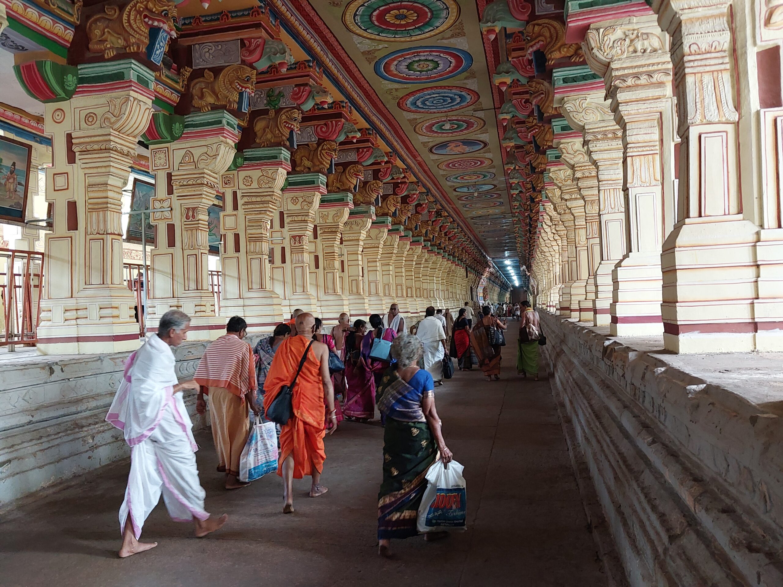 Rameswaram est située sur l’île de Pamban, reliée au continent par un pont en dos d’âne. La vue de la ville qui émerge de là, en particulier du port de pêche en contrebas, est magnifique, si bien qu’en dépit de la circulation intense, beaucoup de véhicules s’y arrêtent, créant un enchevêtrement que l’agent présent ne parvient pas à gérer. En dehors de son temple principal, la ville typiquement indienne, chaotique, bruyante, sale et incroyablement animée, sans architecture ni urbanisme remarquable, ne présente pas d’intérêt particuliers, hormis la route qui en émerge et qui, de manière surprenante, ne mène nulle part. «The end road of India» émerge de la ville sur une bande de sable de plus en plus étroite et file vers la mer à l’est sur une vingtaine de kilomètres, jusqu’à un rond point orné de l’emblème de l’Inde, une colonne avec une tête de lion regardant dans chaque direction cardinale. Jusque en 1964, le village de pêcheurs de Dhanushkodi existait sur cette bande de sable, mais, à la suite une immense vague de cyclonique qui tua cent quinze villageois, l’étroite bande fut déclarée inhabitable. Son prolongement en mer, curieusement nommé «Adam’s Bridge», est une chaîne hauts-fonds rocheux d’une quarantaine de kilomètres qui rattache l’Inde au Sri Lanka. A regarder la carte, on ne comprend pas pourquoi un long pont moderne ne relie pas les deux pays proches, sachant que les hauts-fonds qui affleurent rendent la navigation transversale impossible. Une controverse est née en 2007 des images prises par des satellites de la Nasa. Certaines interprétations prétendaient alors qu’une chaussée continue antique aurait existé. De même, des écrits conservés au temple de Ramanathaswarmy mentionneraient que la bande était émergée avant 1480, avant qu’un cyclone ne la a submerge. En 2017, l’Indian Concil of Historical Research a annoncé une étude sur le sujet, qui n’a finalement pas abouti, alimentant d’autant plus la controverse. Mythologiquement, le pont a existé. La légende raconte que Rama, dont la belle épouse Sita avait été enlevée par Ravana et emmenée au Sri Lanka. s’associa à Hanuman le dieu-singe. Ensemble, ils levèrent une armée de singes, construisirent un pont et rejoignirent le Sri Lanka où une bataille acharnée eu lieu. A l’aide d’une flèche magique, Rama pu tuer son ennemi et retrouver son amoureuse. C’est quand même beau l’amour, hein ?