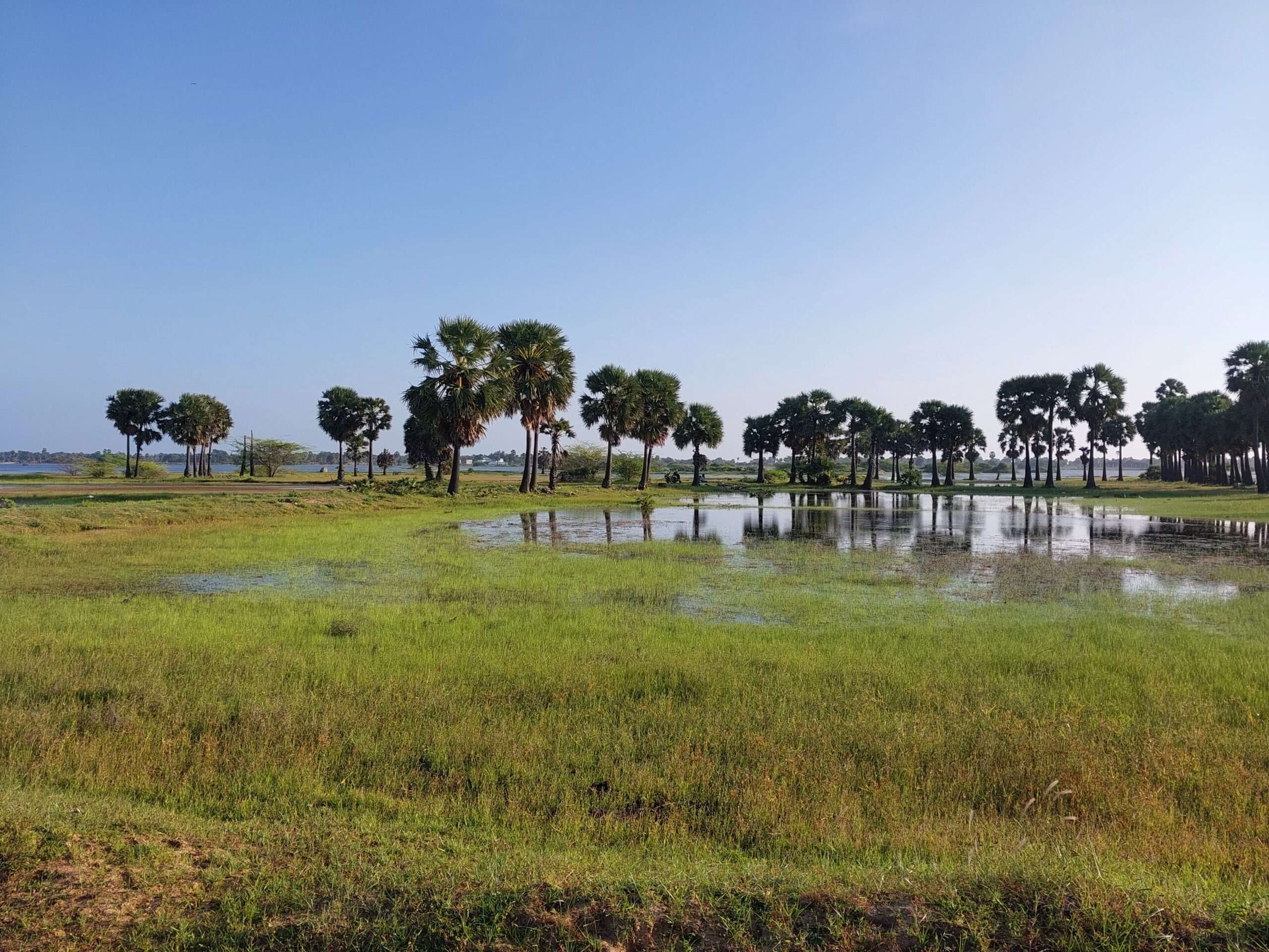 La route vers Rameswaram longe à distance un bord de mer très découpé, tout en méandres, en canaux et détours, où l’eau est omniprésente. Elle traverse des zones de salines et de cultures partiellement immergées, laissant ça et là une petite place pour un bouquet d’arbres, pour un petit temple, ou pour une place herbeuse pour une vache. A proximité des villages, les bassins couverts de nénuphars servent à tout, à la pêche, aux ablutions des hommes, aux travaux des lavandières, aux jeux des enfants. La route pittoresque, serpente dans une nature très verte, inhabituellement silencieuse, où seuls émergent les hauts troncs d’étranges palmiers à la ramure en boule.