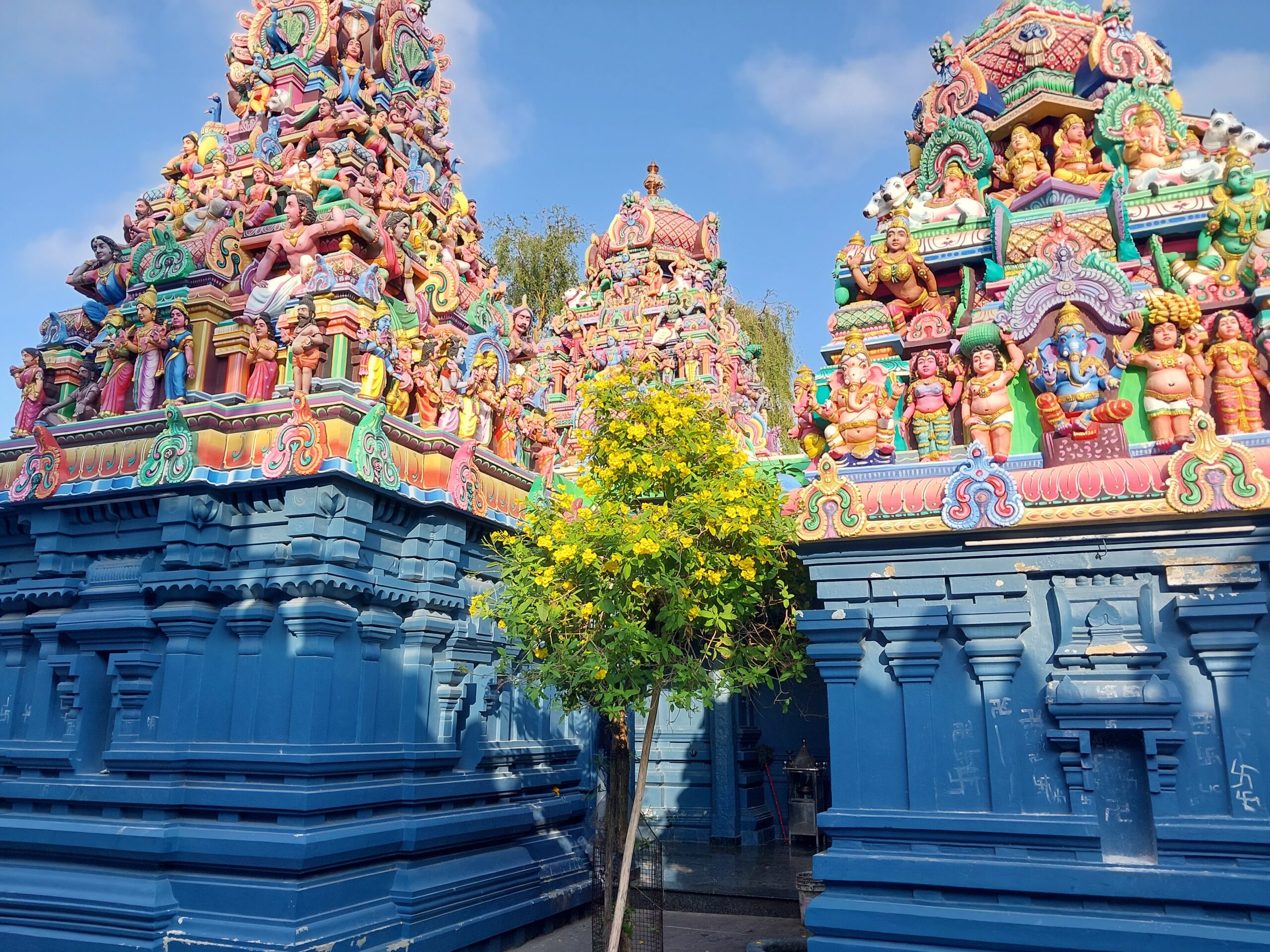 Plus au nord, à Mahabalipuram, Kanchipuram, Chennai, les temples millénaires et divers se multiplient, se dédoublent et se ressemblent, Seul celui de Vellore présente des particularités nouvelles. Ce complexe construit au début des années 2000 sur un terrain de 40 hectares est constitué de plusieurs temples, disposés sur un cheminement couvert en forme d’étoile de 1,8 kilomètre, parsemé de divinités monumentales polychromes. Le temple principal, décoré d’éléments en cuivre repoussé, est entièrement recouvert de 9 à 10 couches de feuilles d’or. Un des temples secondaires abrite une statue de Ganesh de 170 kg d’argent, alors que plus loin c’est une représentation de Laksmi, déesse de la santé, de la fortune, de la beauté, de la puissance, de la prospérité, 70 kg d’or massif, que les fidèles honorent dévotement de leurs offrandes de fleurs, de fruits et de billets de banque. Chez nous aussi on dit «Santé, prospérité», mais dans un cadre différent.