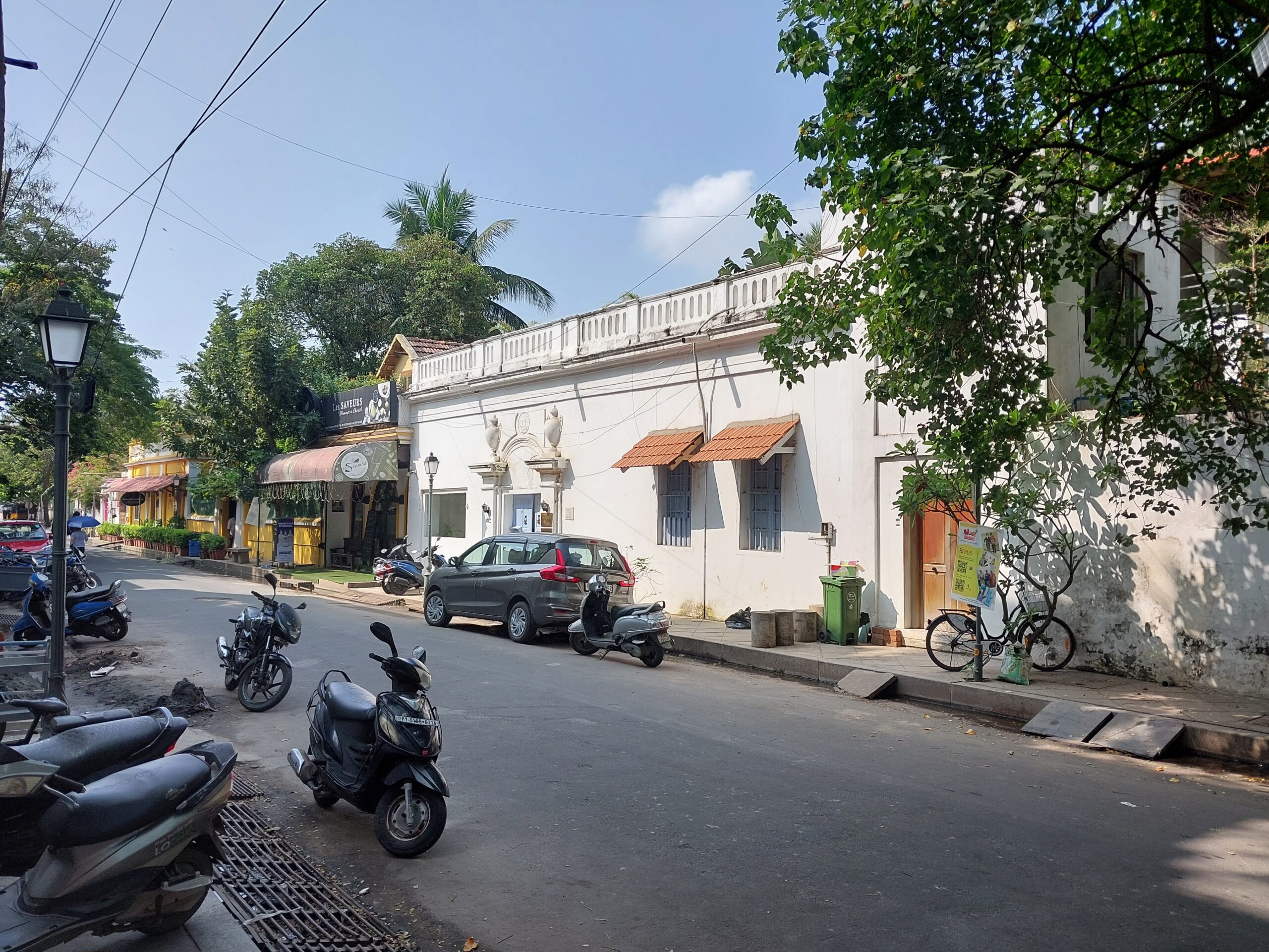 Un peu plus au nord, je rejoins Pondicherry, qui fut une colonie française jusqu’en 1968. Bien qu’elle se soit faite engloutir depuis par sa tentaculaire banlieue, Pondicherry a néanmoins conservé des traces et un fond de culture française qui tranchent avec l’atmosphère environnante. Appelée «Ville blanche», en opposition à la «Ville noire» indienne, la vieille ville coloniale qui jouxte le bord de mer a un aspect très différent des bâtiments indiens construits ultérieurement. Les maisons sont séparées les unes des autres par des espaces, des ruelles, des jardins, des petites terrasses plus ou moins larges, aérant agréablement l’espace. Les façades d’une hauteur de deux ou trois étages, blanche, ou délicatement colorées de jaune paille, de bleu pastel ou d’ocre, contrastent avec les entourages clairs des fenêtres, des corniches et des colonnes blanchies. Les maisons sont proprettes, les boiseries vernies sont soigneusement entretenues, ce qui marquent une différence notable avec les constructions typiquement indiennes, accolées, souvent ternies et noircies par les moisissures et encombrées aux alentours. Les rues sont peu fréquentées, moins chahutées par la circulation et il est assez agréable d’y flâner. Les agencements des restaurants, des hôtels sont aussi très soignés, très propres, meublés à l’essentiel mais avec goût. On trouve des «boulangerie-pâtisserie», écrit en français sur les enseignes, qui vendent du pain levé, des baguettes, des croissants et des viennoiseries. Bien que la ville ne présente pas de particularité notable, il fait bon de s’y arrêter, de s’abriter à l’ombre des églises, de sourire à la vue des fiers policiers en uniforme blanc immaculé, arborant le képi français droit, rouge sang, ou un béret basque pour les policières, de visiter quelques boutiques. Question cuisine aussi, on trouve avec plaisir dans les cartes des mets qui réjouissent l’esprit et calment le palais, bruschetta, steak au poivre, gnocchi pomodoro, salade grecque, vins de France et d’Italie, entre mille choses aux saveurs plus occidentales, jusqu’à même une «cheese fondue aux quatre formages», gruyère, parmesan, cheddar et mozzarella, que je n’ai cependant pas testée.