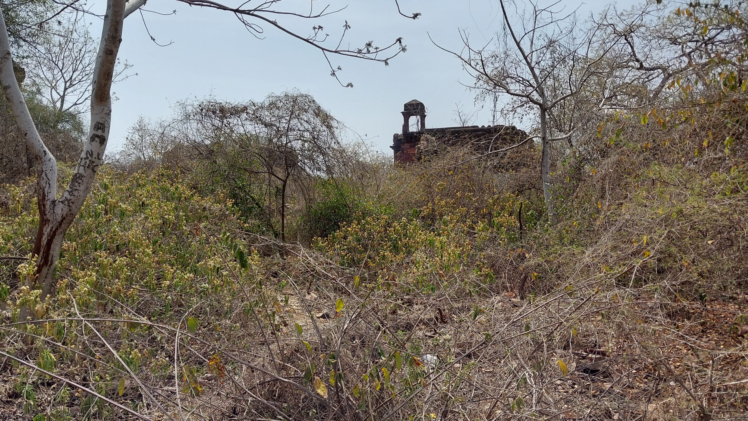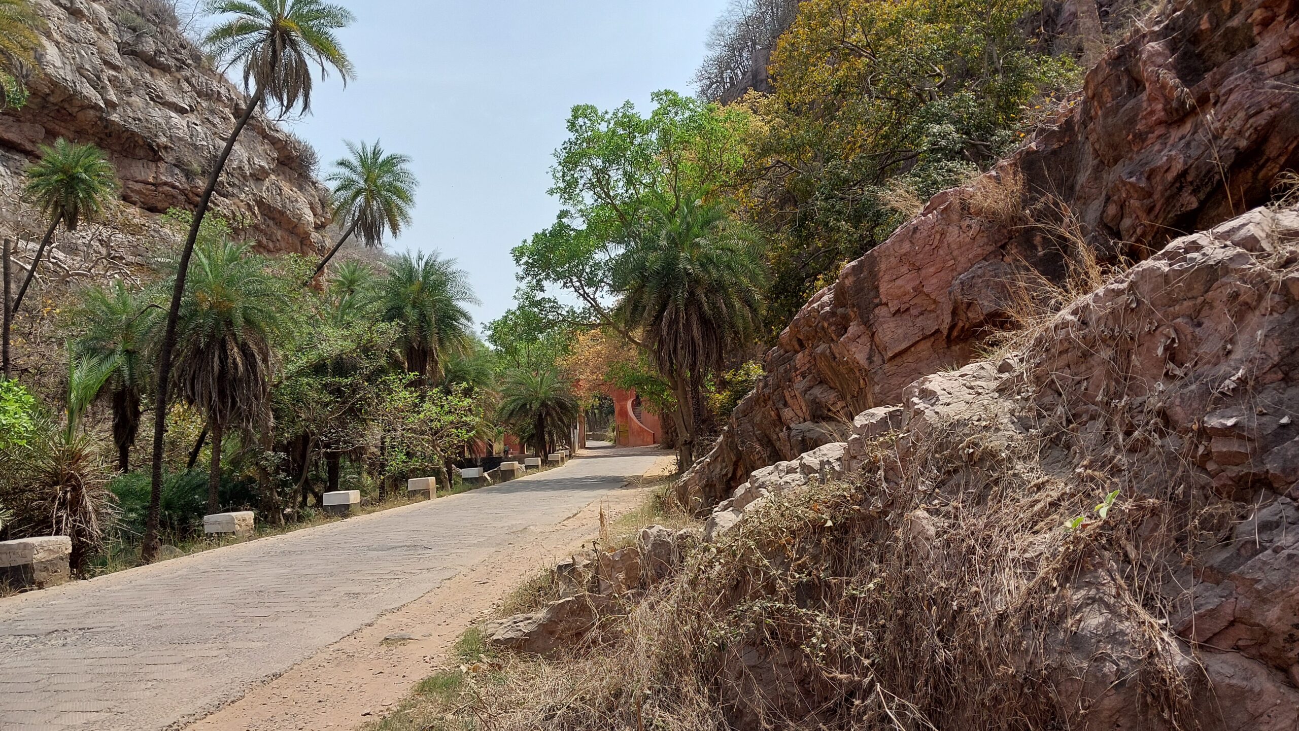 Je mis à profit ce temps mort et pris la route du Fort de Ranthambore qui est dans le parc, accessible par la route d’entrée des safaris. Maintenant la place est dégagée, le portail ouvert, je peux accéder. La route est étroite, seule la largeur d’une voie est recouverte d’un grossier pavage.