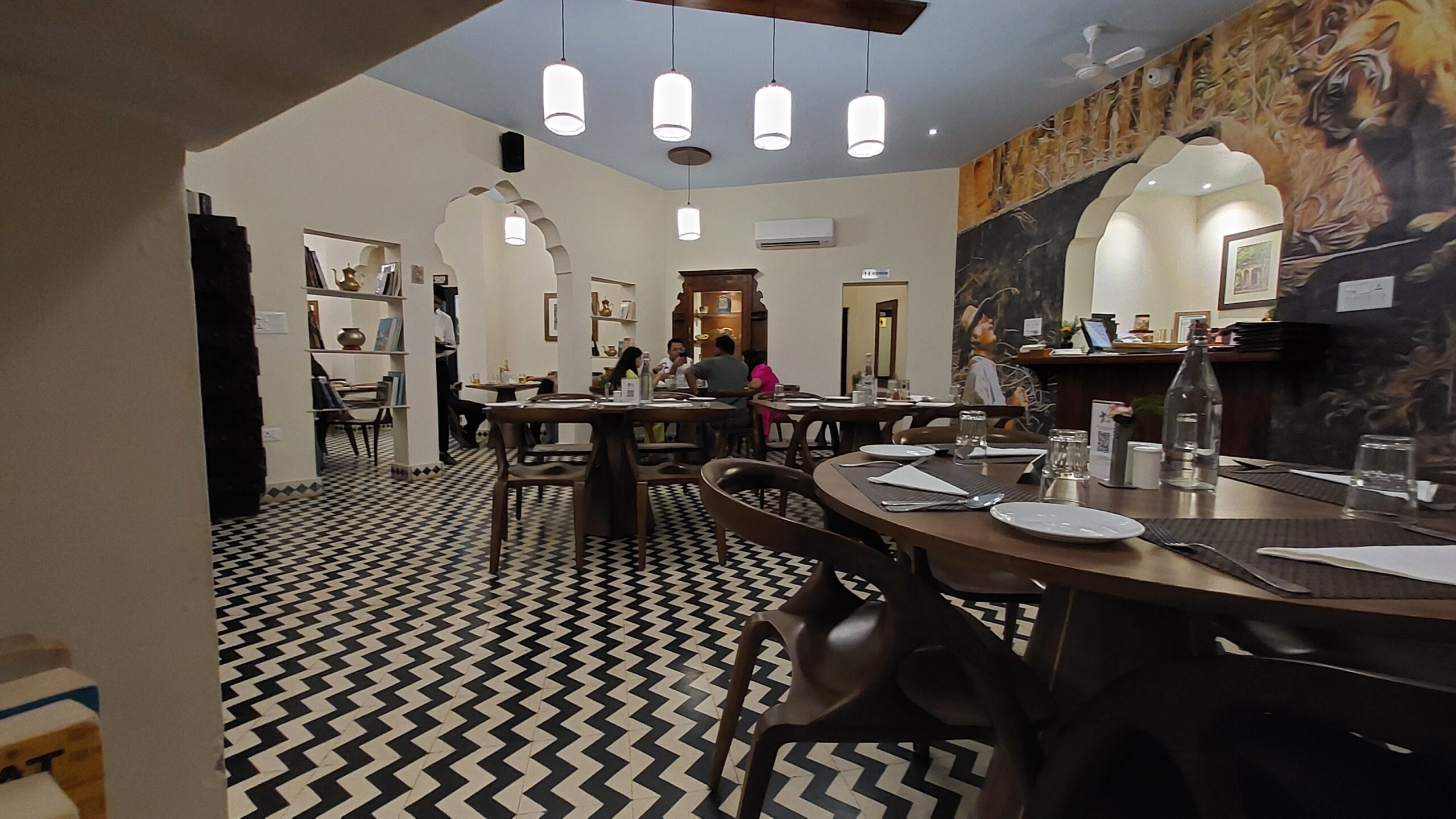 J’avais repéré en parcourant cette route menant à Ranthambore, un bistrot, le Fateh’s Café. J’imaginais un lien avec Fateh Singh le conservateur du parc, d’autant plus que le logo comportait une silhouette qui, à n’en pas douter, était la sienne, allure fière, moustache rajpoute et chapeau de feutre à plumes de faisan. Je m’y rendis donc et profitai de cet espace superbe, très lumineux, aux boiseries soignées, aux ouvertures délicatement ouvragées dans le style régional. En partant, le visage du manager attira mon attention. Son regard vif et franc tout d’abord, et la moustache relevée, noire au lieu de grise, mais tellement semblable. Et les autres traits aussi, plus doux, plus jeunes, mais très ressemblants au logo. Je lui posai alors la question de éventualité d’un lien de famille avec Fateh Singh, tellement la ressemblance me paraissait évidente. Il se présenta comme étant son petit-fils. Il avait vu mon bus parqué devant le café, il me questionna sur mon origine et la machine s’emballa. Son père, que je rencontrai plus tard me rapporta le degré d’excitation de son fils, qui avait parlé à quelqu’un qui avait rencontré son grand-père quarante-deux ans plus tôt et avait même une photo de Fateh Singh. Tous les proches, père, mère, oncle, mais aussi le majordome surent qu’un Suisse de passage avait vu Fateh Singh en personne et en avait montré une photo, et tous voulurent la voir. Plutôt que de me laisser m’installer dans la nature en plein soleil, on m’offrit l’ombrage d’un grand arbre du jardin, ce qui me fut très profitable, la tôle surchauffée au soleil brûlant mettant des heures la nuit à évacuer cette chaleur excessive.