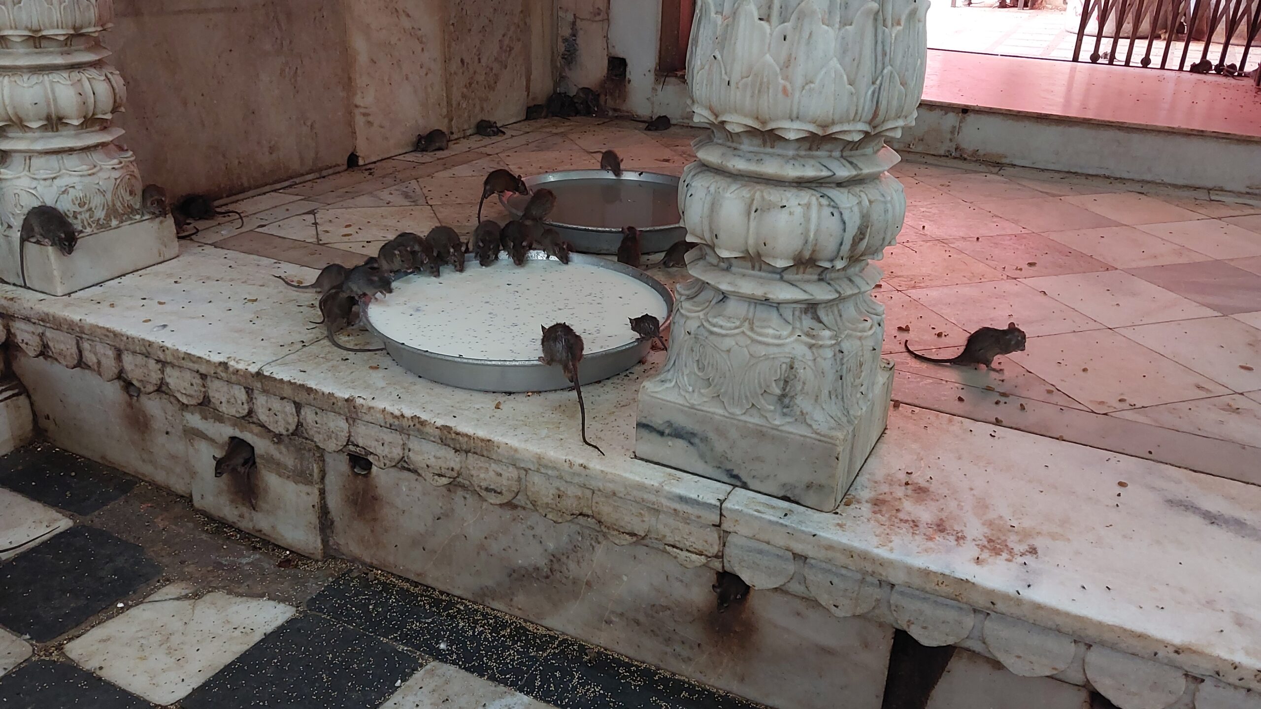 Là, le rat est roi, déifié même. Ils sont plus de vingt mille, choyés, vénérés et abondamment nourris, qui courent, grimpent et se faufilent partout, se glissent entre les jambes des visiteurs pour plonger dans une rigole, s’enfilent dans une cavité, grimpent après une canalisation ou s’amassent dans un coin. Ce sont des rats noirs et parvenir à en apercevoir un blanc serait un gage de grande chance.