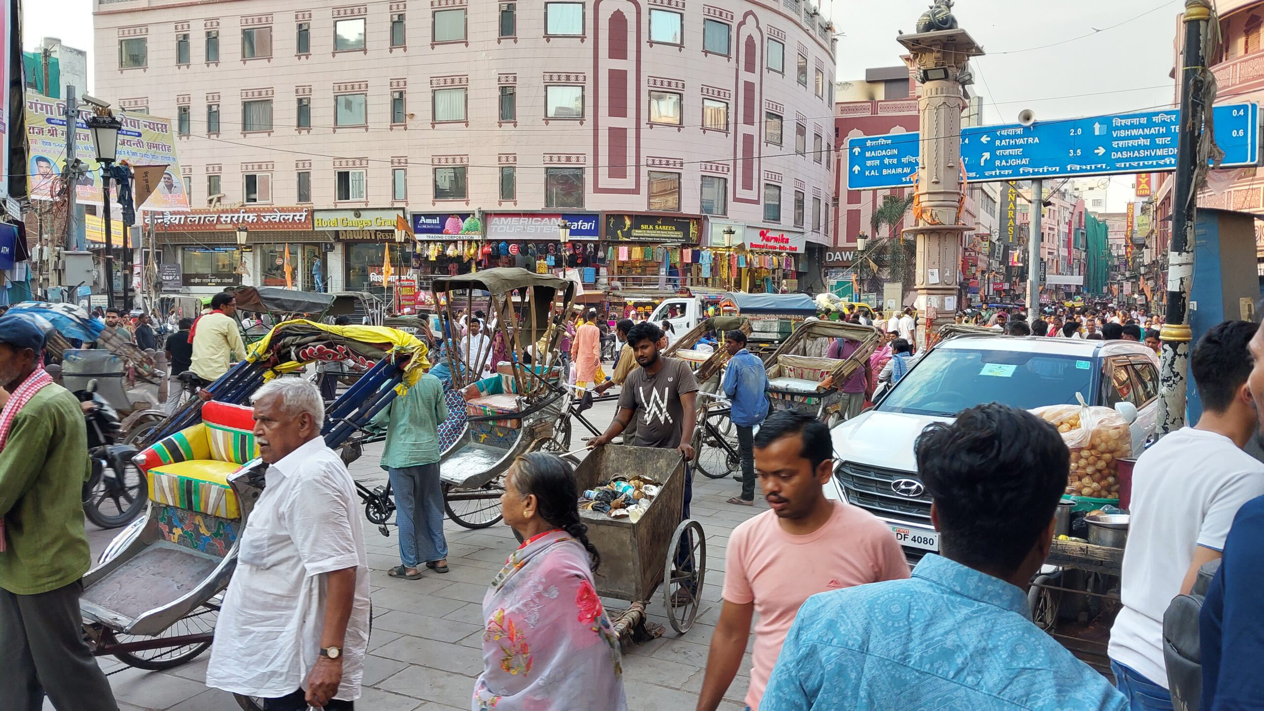 Les rickshaw-pullers m’impressionneront toujours. Si le cyclo-rickshaws a pratiquement disparu des villes indiennes, je n’en ai vu que très peu jusqu’à maintenant, à Varanasi il y en a encore énormément, tous menés par des vieux conducteurs, dans la soixantaine probablement, secs comme des triques, les bras noueux tirant sur le guidon, le genou cagneux, le mollet tendu, le pied cintré par la poussée sur la pédale, déplaçant deux quintaux d’élégantes avec leurs courses, ou de sacs de ciment, de bidons d’huile, de ferraille, ne mettant pied à terre que pour passer une légère côte, couché sur le guidon pour pousser la charge, avant d’enfourcher avec aisance dès la bosse franchie et de se laisser glisser sans effort de l’autre côté.