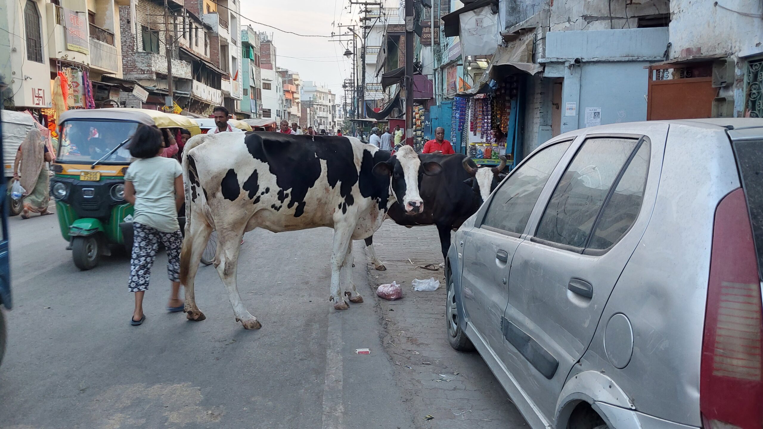 Là, je retrouve l’ambiance des rues basses du «Roi et l’oiseau», des ruelles étroites, encombrées comme jamais de tout ce qu’une basse ville peut porter, des échoppes débordant sur la rue, l’égout défoncé, des escaliers encombrés, des rangées de deux roues empiétant, des piétons, des cyclo et des moto-rickshaws, des chiens, des voitures, des vaches, des camionnettes, des autocars, le tout dans le bruit strident des klaxons actionnés en permanence.