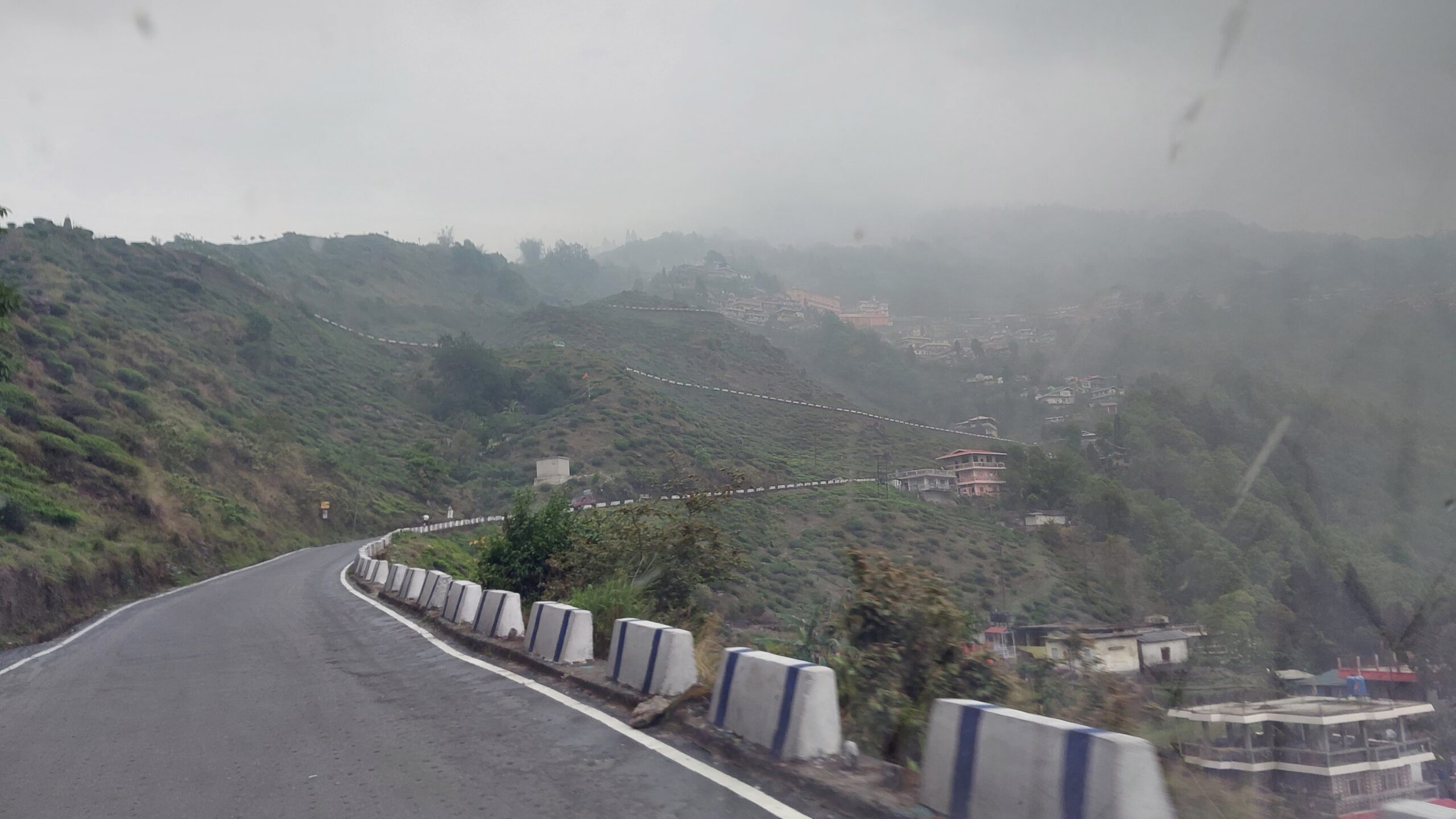 M’engager sur cette route de montagne m’apporta immédiatement un profond réconfort. Le changement était total. Le plat interminable laissait place à la montée sinueuse, le vert profond soulageait ma vue, la brume abaissait la température, je me sentis revivre, je touchai au but. L’ambiance me rappelait les routes étroites des vallées tessinoises, les épingles relevées, le parapet jouxtant l’abîme. Je dus manœuvrer une fois dans un virage ou je croisai un véhicule descendant. Cependant, si cette bagarre permanente à la conduite pendant de nombreux kilomètres m’animait, me vivifiait, les ralentissements, les croisements délicats, rétroviseur contre rétroviseur en frôlant la glissière ou le rocher, elle n’était pas non plus sans m’éprouver physiquement. Je n’avais encore rien mangé et aucun espace ne me permettait de me poser ne serait-ce que quelques instants. Mais je me réconfortai à l’idée que bientôt je me glisserai dans un jardin, un petit espace de verdure charmant où je pourrai abandonner la conduite quelques jours, aller marcher, m’oxygéner, me régénérer. Ce n’était qu’une question de minutes. Je passai laborieusement deux villages, Sonada et Ghum, aux maisons accrochées à la pente raide, les devantures à raz la chaussée déformée.