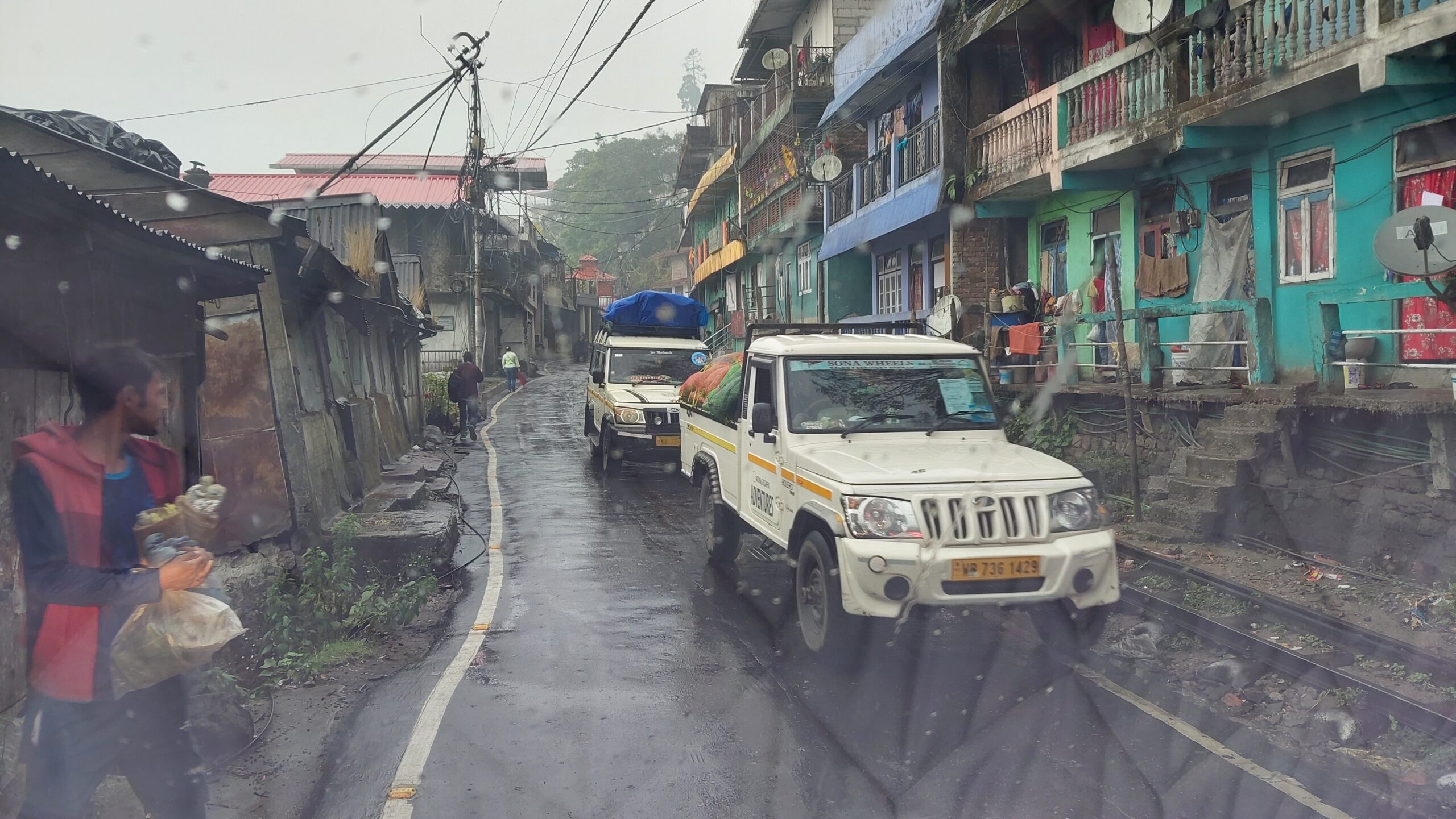 Darjeeling est une étrange petite ville, accrochée aux flancs très raides de la montagne. De part et d’autre de la rue principale, les constructions sont montées sur de hauts pilotis de béton ancrés dans la pente. Tout est étroit, encombré et l’unique chaussée à deux voies se partage avec un petit train de voyageurs bien réel, certains convois tractés par une motrice contemporaine à moteur diesel, d’autres par d’antiques locomotives à vapeur crachant une épaisse fumée noire. Il n’y a quasiment aucun espace de dégagement, alors quand un convoi arrive, le chaos est total, les véhicules s’enchevêtrent, se poussent, se frôlent, se coincent, se rapetissent pour libérer la voie l’espace quelques instants et sur quelques dizaines de mètres, puis tout reprend sa place lentement. Dans ces moments, il faut de la minceur, de l’agilité, de belles qualités qui me font totalement défaut. Passé la gare, la tension descend quelques peu avec un trafic très diminué. Je trouve un faible espace me permettant de m’arrêter, juste le temps de changer l’adresse de destination dans le GPS. Yuksom, que j’imaginais être dans la banlieue proche se trouve une centaine de kilomètres plus loin ! Grand moment de solitude.