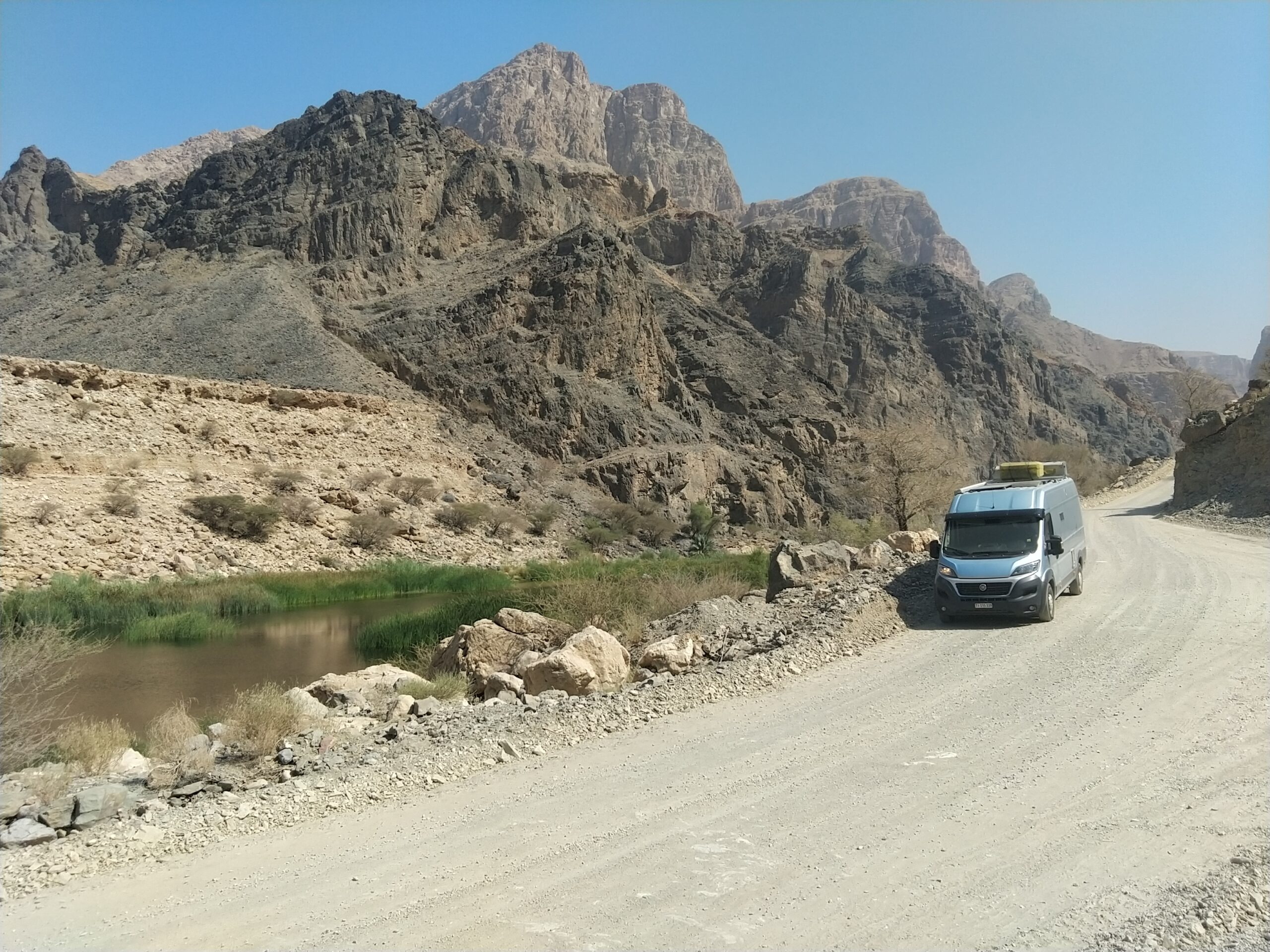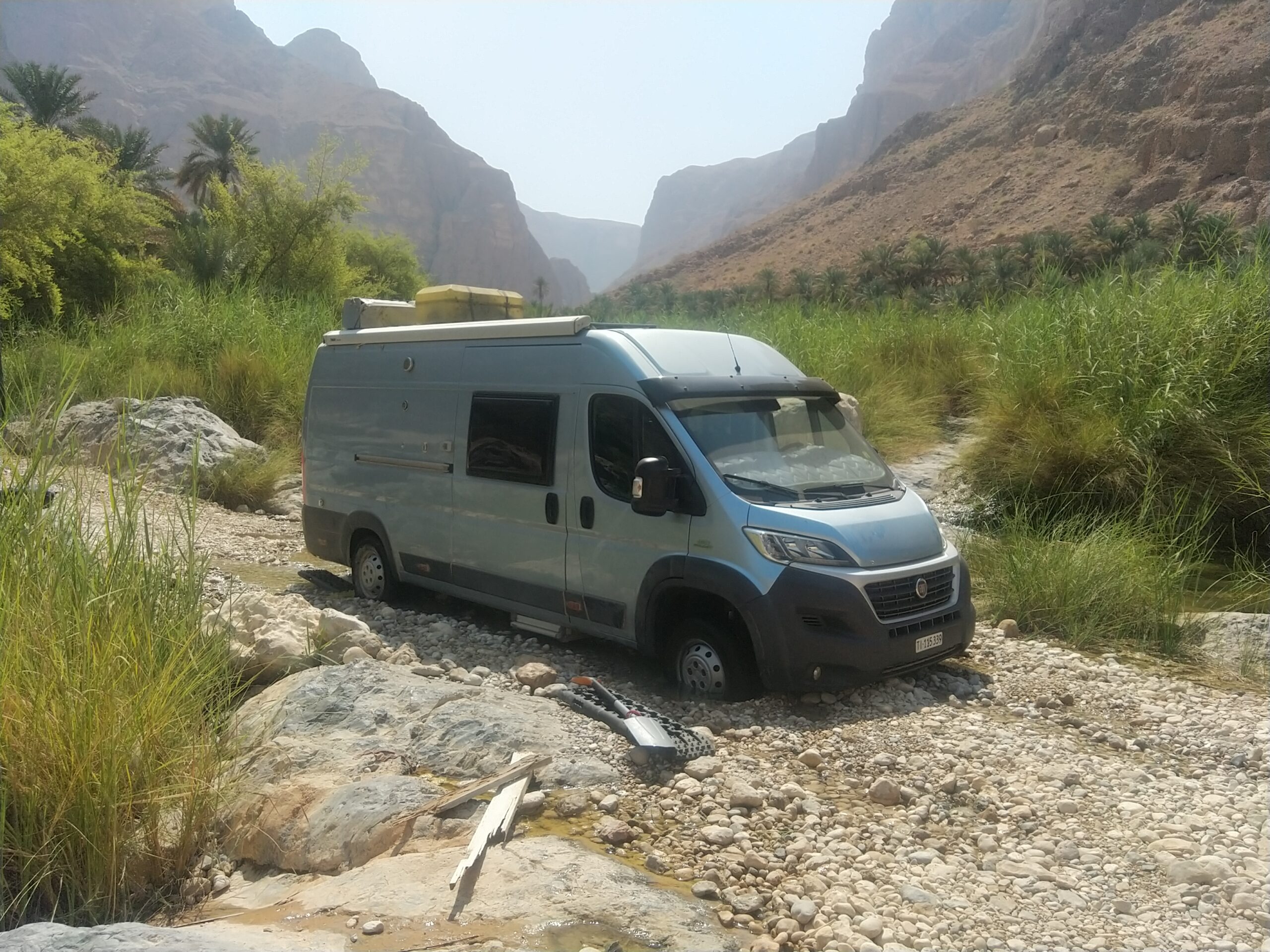 Je m’étais mis dans l’idée de m’approcher un peu des dunes de sable fin, de m’éloigner raisonnablement des pistes faciles, de tester les capacités de franchissement du bus, dont j’avais pu ressentir ici et là la morsure de la gomme sur les revêtements caillouteux, comme sur le béton raide. J’étais plutôt satisfait du comportement robuste du véhicule, confiant dans mes capacités à reconnaître les difficultés visibles et rassuré par l’équipement accessoire, les plaques de désensablement et la bonne pelle en acier. Aussi, quand au fond du Wadi al Arbeieen un villageois m’a indiqué une position de campement isolée près de la rivière, après avoir fait à pied une brève reconnaissance des cent derniers mètres du mauvais chemin de terre, du relief mouvementé et de la petite rivière caillouteuse avec quelques centimètres d’eau, j’y suis allé confiant. Prudent, j’aborde toujours les difficultés lentement, comme si je simulais la position lente d’une boîte de 4×4. Je suis donc descendu lentement dans la petite rivière et le train avant, au lieu de marcher sur des œufs comme je l’avais fait quelques minutes avant, est descendu en douceur dans la couche de galets lisses et s’y est enfoncé, comme un enfant plongerait dans une mer de balles, et s’est posé sur le châssis. Et m…. ! Ensuite, plus je pellais, plus je dégageais les roues pour positionner mes plaques, plus la roue descendais, poussée par la suspension, le reste demeurant posé sur les pierres. Mes sangles de dépannage vont bien, merci pour elles. Le pickup qui m’a tiré de ce mauvais pas n’en avait pas, et donc mon équipement se confirme être au niveau de ma maladresse. Finalement, j’ai renoncé à un tour dans les dunes, histoire d’éviter d’aller me planter seul dans le sable profond.