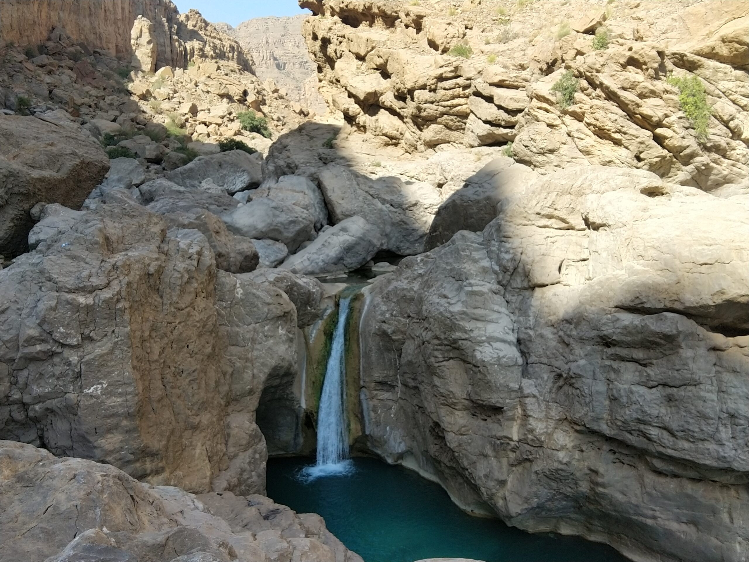 Wadi Tiwi, le wadi voisin, parallèle, présente des caractéristiques très différentes. Il est accessible par une petite route qui relie les villages et, selon les commentaires glanés sur le net un 4×4 n’est pas indispensable. L’approche se fait par une large piste sur le fond de la vallée, qui ensuite grimpe, puis redescend fortement en plusieurs vagues, avant de parvenir à un embranchement, puis un premier petit village. La route maintenant bétonnée et très étroite se faufile ensuite entre les maisons, se glisse derrière les murs, grimpe dans la pente raide, de plus en plus raide, par paliers successifs. Les pneus accrochent, râpent un peu dans les virages relevés, mais l’adhérence est bonne, la transmission intégrale fonctionne à merveille. Veillant à maintenir un régime moteur optimal, je garde la première et les gaz le plus à fond possible, ralentissant à peine, même dans les virages serrés. Ça grimpe. Je frôle de gigantesques rochers qui débordent sur la chaussée étroite et la pente se redresse encore. A ce stade je suis coincé, je ne peux plus ralentir, je ne dois pas caler, ni m’arrêter, rien. Ça doit absolument passer. Un retournement est impossible et une marche arrière serait un cauchemar hasardeux. Pourtant, malgré mes encouragements, mes prières impudentes et la tension de mes tripes, je sens le régime qui faiblit, les tours moteur qui descendent, l’essoufflement graduel de la mécanique. Un léger angle à droite me masque la suite. Je tends le cou, je redresse le dos, je cherche un espace, je veux, je dois absolument pouvoir m’arrêter sinon je vais immanquablement me planter. Mais il ne le faut pas, non, non ! La pente faiblit d’un rien, le régime moteur remonte un peu et soudain, quelques maisons apparaissent avec quelques pickups sont garés. Un court replat avec un espace dégagé le long du petit muret me sauve. J’y plonge sous le regard surpris de quelques autochtones. Je sers le frein, stoppe le moteur et m’adosse au siège. J’expire. Je respire. J’expie ma naïveté, je dégouline mon effronterie. J’essaye de relâcher la tension, de calmer la chamade dans ma poitrine, de chasser le stress. Je respire, et je mesure ma chance. A ce stade, je n’ose pas encore regarder sur ma droite, la pente à côté de cette petite place, la petite route qui continue, qui s’est encore redressée, qui vire à droite sur le flanc de la montagne dans un virage impossible, suivit d’un autre et qui s’en va vers un destin inconnu. Il m’a fallut une bonne demi-heure pour reprendre mes esprits, pour simplement pouvoir marcher sans vaciller, pour voir ce qui m’entoure, que mes yeux regardaient alors que mon esprit ne réalisait rien, restant bloqué dans la tension accumulée. On s’approche de moi, on devine mon inconfort, on sent ma peur. Je m’enquiers de la suite. A pied, c’est deux heures de marche sur une route cimentée, raide, sous un soleil de plomb, les jambes en coton, à mettre en balance avec une opportunité de transport en 4×4. Un villageois se rend au village suivant, là où sont les belles vasques naturelles. Shoukran, ce n’est pas de refus !