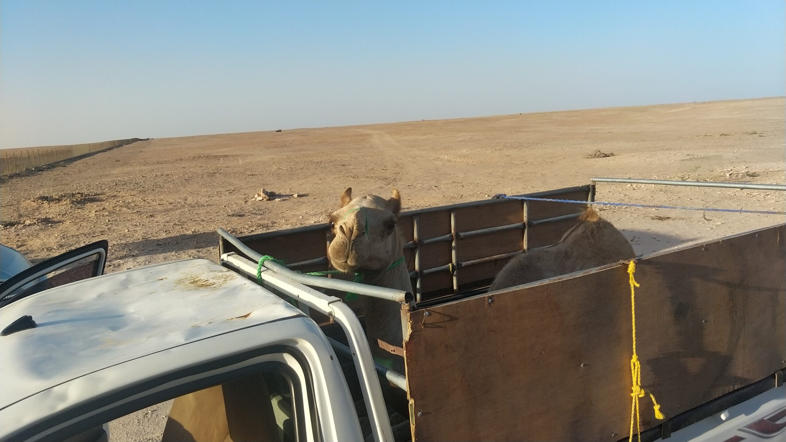 En remontant de Salalah vers Nizwa, j’ai parcouru la route centrale du pays, un long ruban asphalté de neuf cents kilomètres, qui traverse un décor immuable de caillasse beige sur fond de montagnes lointaines. C’est un tracé monotone qui devait me prendre deux jours, sans distraction autre que l’arrêt de quelques minutes pour faire le plein, boire un chai et me sustenter d’une brochette. Al Wusta. Je l’avais vu sur la carte, mais je n’avais pas relevé le lieu et c’était sorti de ma mémoire. C’est donc sur la route, au le panneau avant le croisement de Haima que ça m’est comme tombé dessus. Al Wusta, sanctuaire de l’oryx arabe. Le panneau me proposait un détour inattendu, à mi-distance de mon long trajet vers Nizwa, ainsi je bifurquais à Haima, m’enfonçant dans le désert sur une route droite, sans aucun trafic, uniquement bordée de temps à autre par un arbuste isolé. Seul le panneau suivant, indiquant le sanctuaire à la dernière bifurcation put me sortir de ma léthargie. L’étendue de sable et caillasse m’entourant était uniformément plate, infiniment vaste et rien, sinon le vol de quelques oiseaux noirs ne troublait ce décor. A la bifurcation, l’asphalte laissait place à une piste rectiligne, sans défaut, me permettant de rouler vite. Visible de très loin, le drapeau omanais annonçait la première clôture. Je croisais là un pickup qui allait en sens inverse et transportait sur son plateau une femelle dromadaire agenouillée, solidement ficelée, accompagnée de son petit.