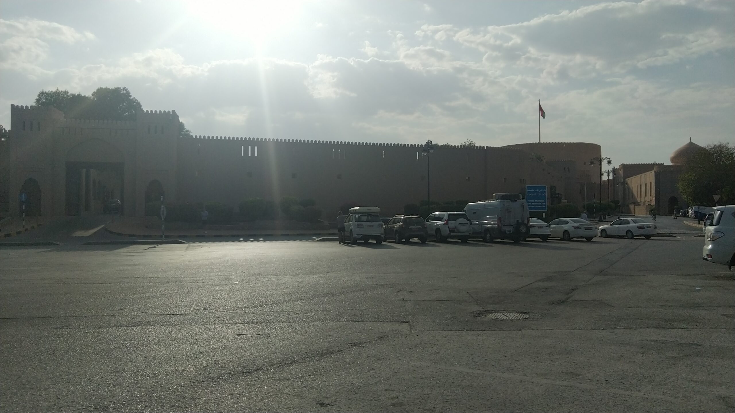 Nizwa, sur ma route vers la frontière émiratie, m’offre l’opportunité d’une halte. La ville est l’ancienne capitale du Sultanat dont le centre historique a été récemment entièrement restauré. Le fort, sa grande tour ronde et son imposante muraille bordent la place principale, peu fréquentée encore en fin d’après-midi. Elle sera bondée dès la tombée de la nuit et je peinerai demain à trouver mon chemin vers la sortie. Le vendredi, jour du rassemblement (joumouaa) pour la prière principale de la semaine, des hommes discourent assis sur un muret, des familles pique-niquent dans les allées, des têtes penchées sur des capots ouverts, commentent ou investiguent pendant que des abris solaires et des tentes de marché sont installés ça et là. Dans cet enchevêtrement labyrinthique, mon bus manque d’agilité et de minceur, forçant à déplacer des voitures, à retenir de nouveaux arrivants et à me guider entre les obstacles dans une chaleureuse et vivante confusion.