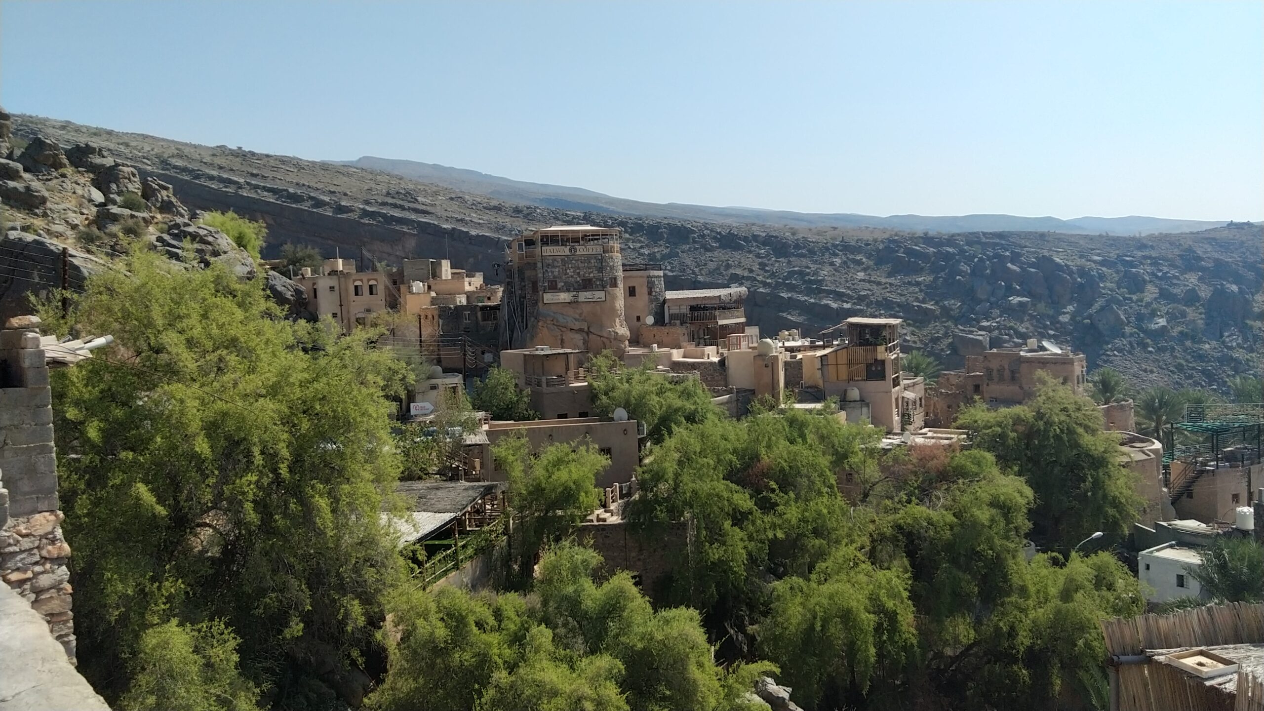 A quelques distances de là, Misfah al Abriyyin est un petit village de montagne que d’aucun qualifie de plus beau village omanais. Le village est accroché à flanc de montagne, dans un environnement de gorges et de roches brutes inhospitalières, dominant une dense palmeraie de dattiers en terrasses. Le contraste est saisissant, le brun-rouge brut de la roche et le blanc des bâtiments s’opposant à la délicatesse vert vif du feuillage. L’atmosphère du village lui-même, ses étroites ruelles, les passages voûtés, les escaliers et dégagements me font immédiatement penser à certains vieux villages montagnards étriqués de chez nous, Corippo, Visperterminen, Splügen, accrochés à leur montagne, à leurs efforts constants et aux mille difficultés qu’ils rencontrent pour se maintenir et survivre. Plus d’un mur est écroulé, plus d’un niveau est effondré, plus d’une bâche recouvre un espace à reconstruire, mais l’ensemble reste charmant, paisible et mérite une visite. Ce lieu est juste à mille lieues des tours et artères de Dubai, que je vais rejoindre demain.