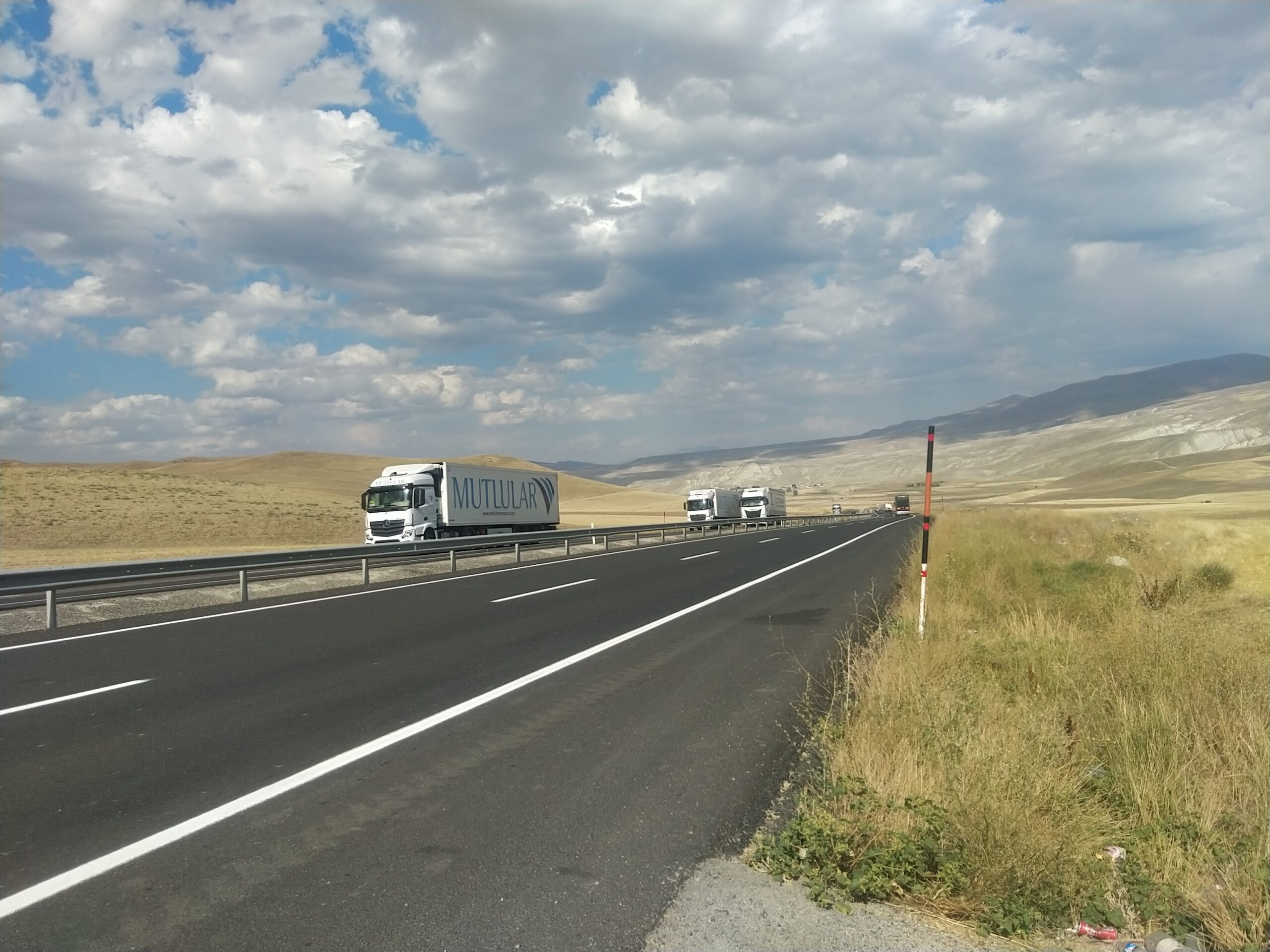 De Kayseri à Dogubayazit, une route large et confortable, très bien entretenue et sans nid de poule, s’étire sans fin sur neuf cents kilomètres. Construite comme nos autoroutes avec une berme centrale et deux pistes dans chaque sens, plus une bande de secours qu’empruntent les tracteurs, elle est plutôt modérément fréquentée, ce qui permet une conduite rapide et agréable. Elle serpente paresseusement dans les creux de vallons, se faufile dans quelques gorges étroites, grimpe en ligne droite et raide sur les collines pour replonger derrière, puis se relâche. Elle se détend alors de l’accélération excessive due à la descente et repart en douces courbes au fond des vallons. L’herbe aux alentours est jaunie par la maturité et la sécheresse. Les cultures de céréales sont fauchées et seuls quelques buissons ou bosquets verts donnent à ce décor une touche contrastée qui accentue la sensation d’étouffement.